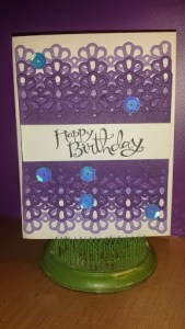 I started my card base using Neenah Solar White card stock and cut it to an A2 size (4 1/2 by 5 1/2). I chose 3 shades of purple paper for my card. The purple paper was purchased at Hobby Lobby. Unfortunately I don’t know what brand the paper was at Hobby Lobby as it didn’t say. It is fairly thick and is textured though the core of this paper is the same color rather than white which is nice.