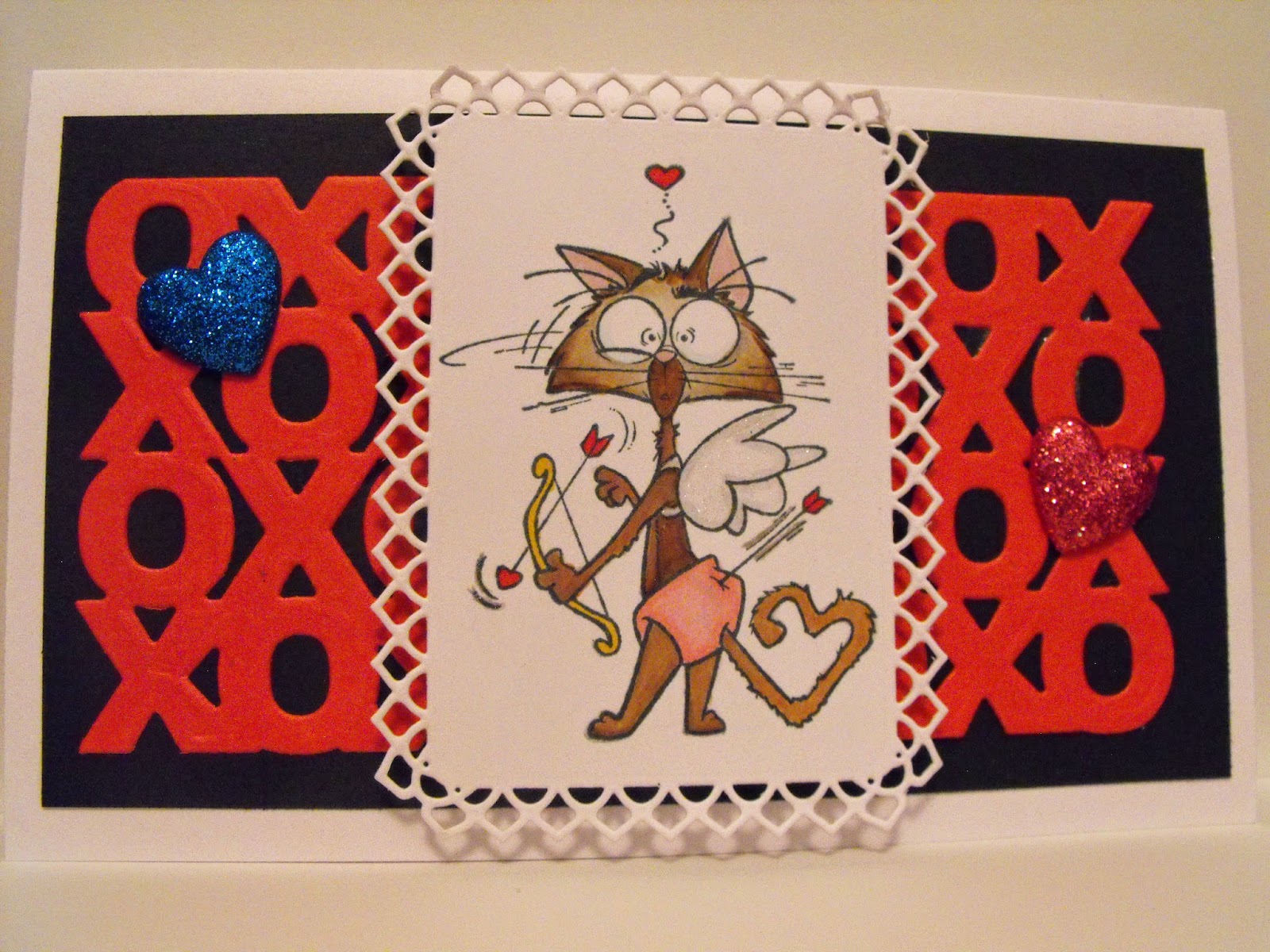 I used the Spellbinders Nestabilities Labels 40 die and cut Mr. Grouchy out and put some dimensional foam squares on the back. For the background I die cut two of the the Anna Griffin XOXO dies in red and then put them on black paper to give them a little pop. I put the Grouchy Cupid colored image over top of the die cuts (which also served to hide the center point seam of the two die cut XOXO pieces). To add some more dimension and interest I added in a couple of little glitter hearts from Recollections. I think it turned out very cute!