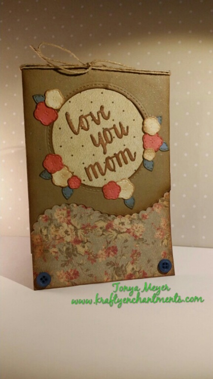 I used the words “love you mom” from the WPlus9 die set and cut them from the brown kraft cardstock and glued them on top of the polka dot card stock. I added a little clear Wink of Stella to the die cut words for some sparkle.