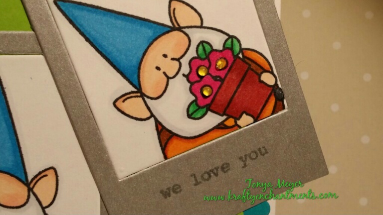 I put the Poloroid frames together with each of the colored gnomes and arranged them to look like a succession of pictures that were taken. I adheared them to the lime green cardstock from Spellbinders Celebrations which I’d cut out the little X’s with the Die-namics Blueprints 20.