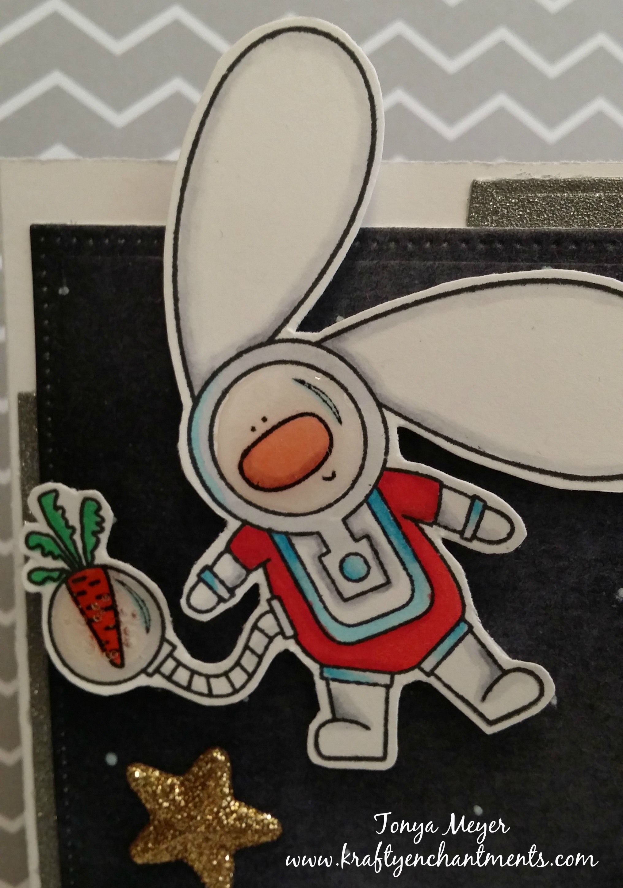 First off I colored up Mr. Bunny in his space suit and his little carrot with my Copic markers. I kept the colors pretty simple as I knew my background would be a dark, space-like setting. Once I finished coloring him I fussy cut him out and then added some Ranger Glossy Accents to his mask and the carrot’s bubble to give it the look of glass. I let that dry overnight while I worked on the rest of the card.
