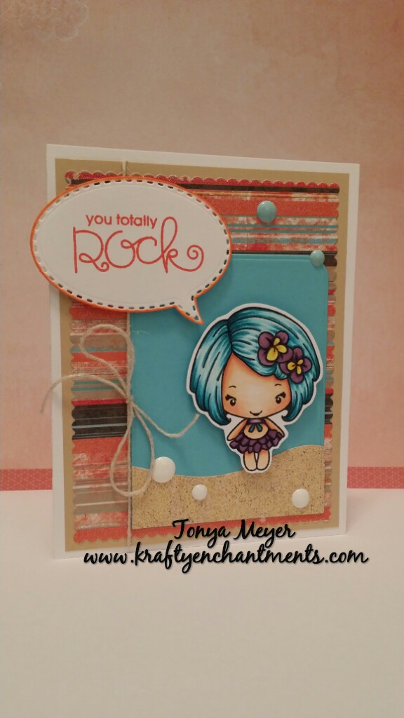 I also gave her a nice purple bikini and some bright purple and yellow flowers in her hair. Once I was finished I fussy cut her out and added some dimensional foam to the back of her and set her aside to prepare the rest of the card.
