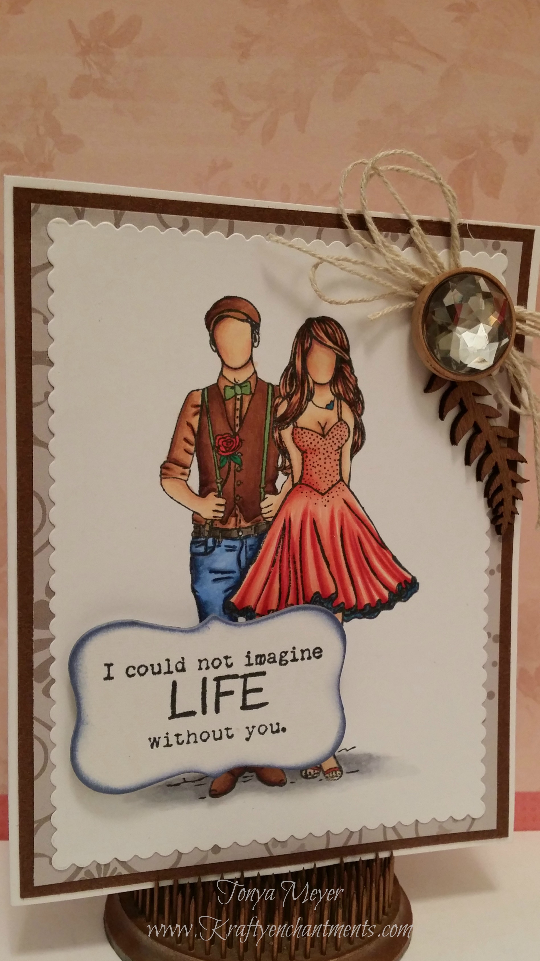 Next I used a piece of white chipboard and stamped the sentiment from the same stamp set, “I could not imagine Life without you” and added some blue distress ink to the edges of the chipboard to finish it off. I placed it near the bottom of my card using some dimensional foam.