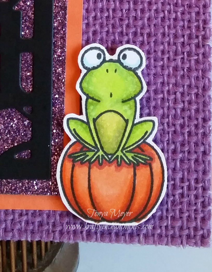 To create my card I used my Copics to color my candy hungry little witch and then created a simple mask to put the frog on top of a pumpkin from the set and colored it with my Copics as well.