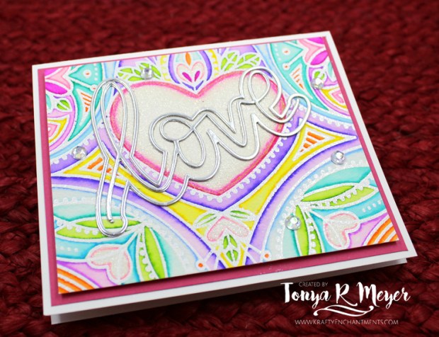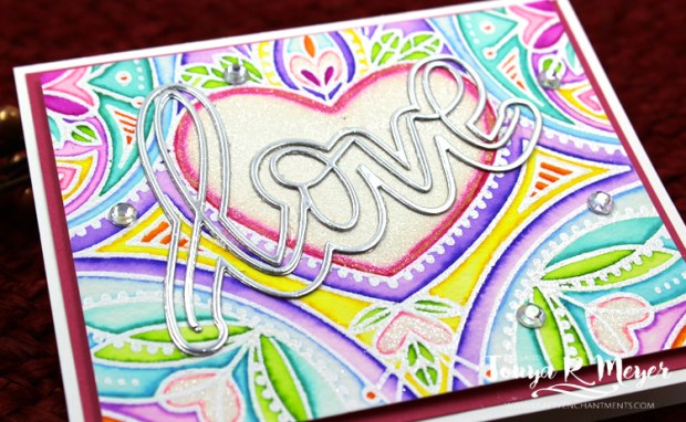 When the words were glued into place, I used a clear Wink of Stella pen to add a lot of shimmer to my center heart and the smaller hearts on the background. I love the added shimmer with the bright colors. It’s so pretty in person.