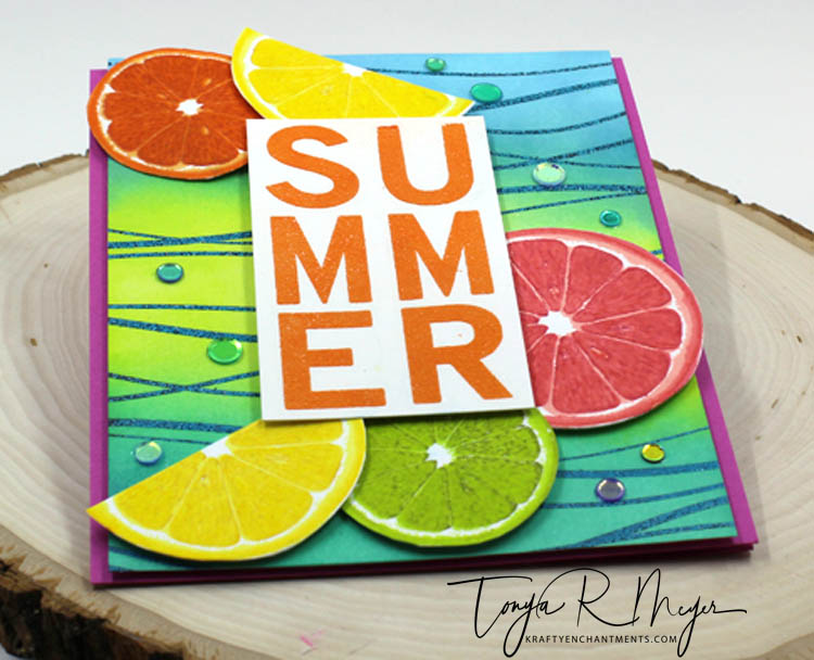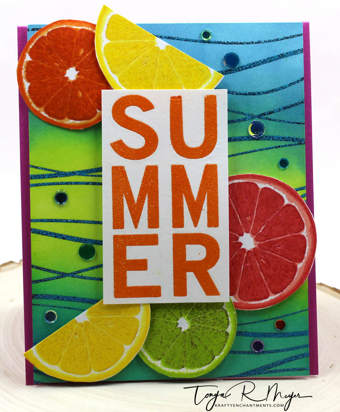 While stamp layering is not difficult at all, I like when I can use a layered stamp that does not have to be perfectly lined up. The Main Squeeze stamp set from Altenew was so fun to create with and I did not feel like it had to be perfect because many times the insides of lemons, limes, oranges and grapefruit are perfectly imperfect.