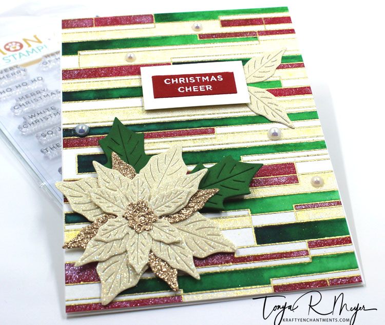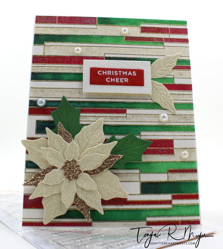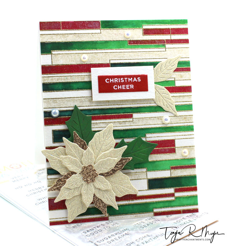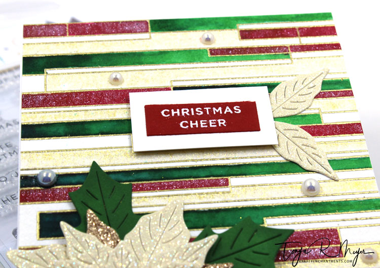 I popped the sentiment up on my background using some dimensional foam. I used an extra set of poinsettia leaves and glued them in place under my sentiment.
