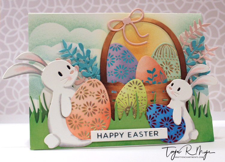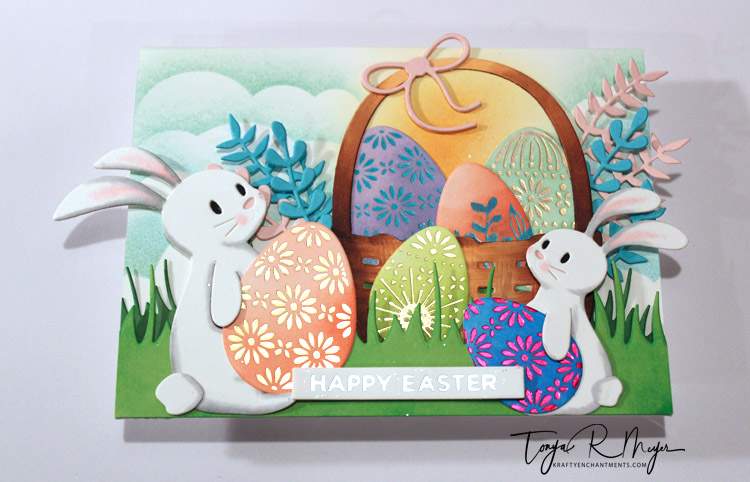 I also took the time to use one of the Glimmerplate sentiments that came with my March kit to foil the Happy Easter sentiment and cut it out with the sentiment strip die cut.