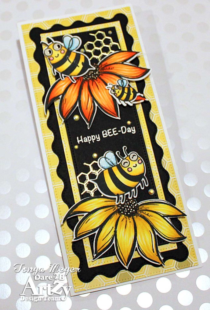 I colored the largest bees from the set with my Copic Markers and die cut with the coordinating dies. I also stamped and colored one of the smallest bees from the Honey Bears set. The images were all stamped using Dare 2B Artzy’s Totally Black ink and stamped on 100lb Accent Opaque cardstock. The Totally Black ink is alcohol ink friendly so it’s perfect for all of your alcohol marker coloring.