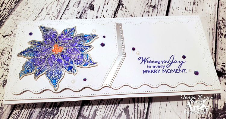 I cut the embossed panel down using one of the Dare 2B Artzy Wavy Slimline Framelets dies and then used the V-shaped border die from the Dare 2B Artzy Wavy Slimline Border Dies and cut the embossed background piece down to make it a focal panel to place my poinsettia image on.