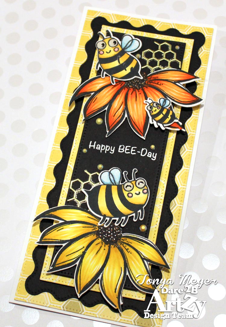 First, I had to include the Buzzzy Beez slimline card that I created. I really loved using these fun beez paired with the Holly Xmas stamp set to create some awesome flowers for my beez. I enjoyed being able to take a Christmas stamp and use it for a non-Christmas card. I really love how all the bright yellows and orange’s pop against the black background.