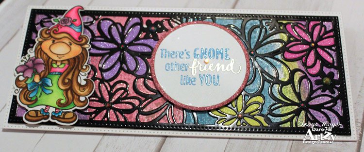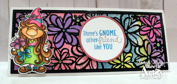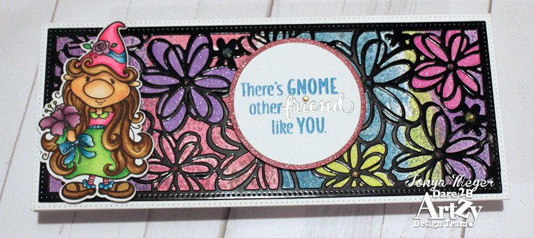 I knew the little Dare 2B Artzy gnome would be perfect for this background. I stamped and colored her with Copic markers and used the coordinating die to cut her out. I popped her onto the background with some dimensional foam tape.