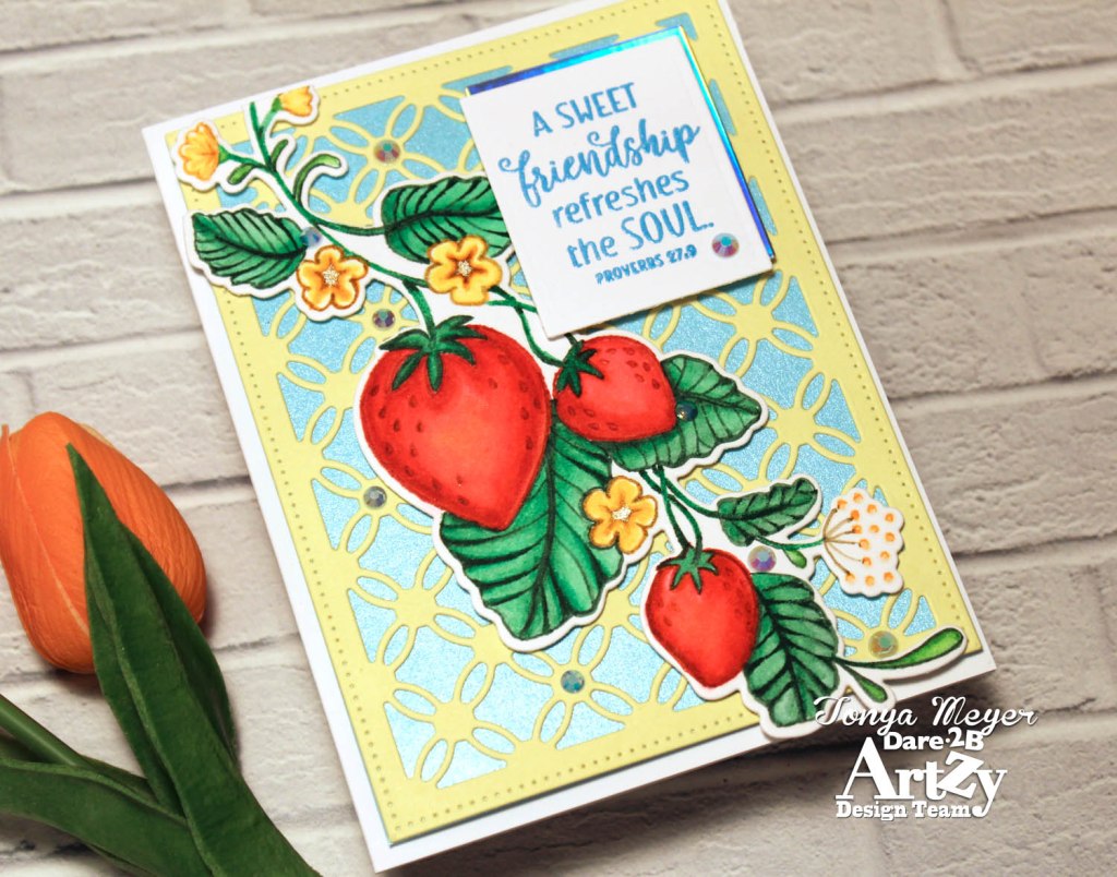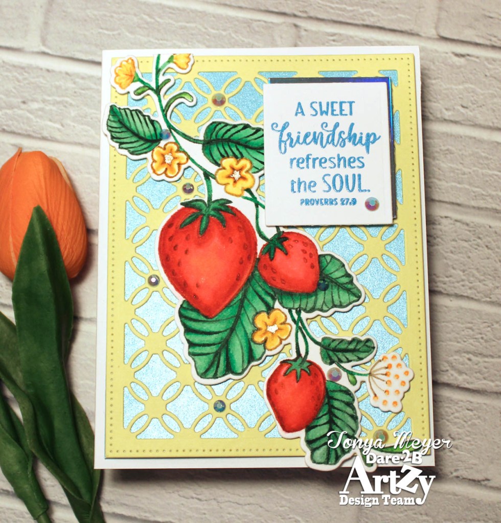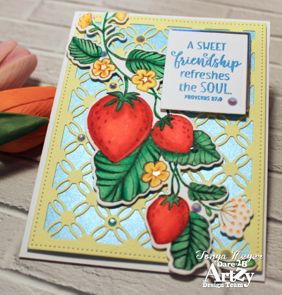 My card base was created with the Dare 2B Artzy Trellis Die which was cut from some bright yellow cardstock. I layered a piece of sky blue shimmer cardstock behind the trellis. I think it makes a perfect backdrop for the strawberry vine.