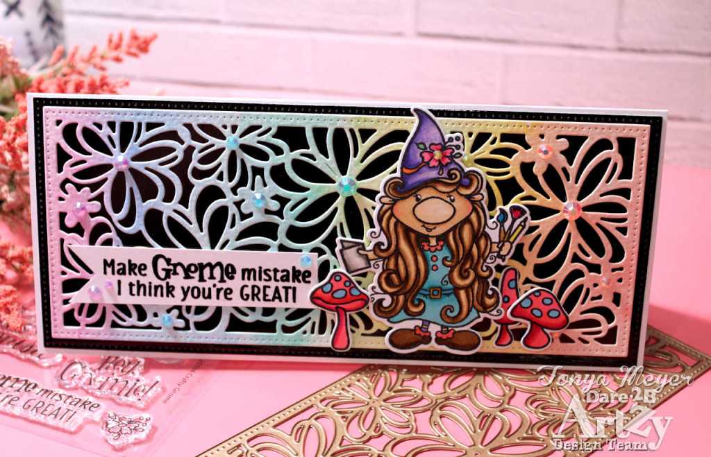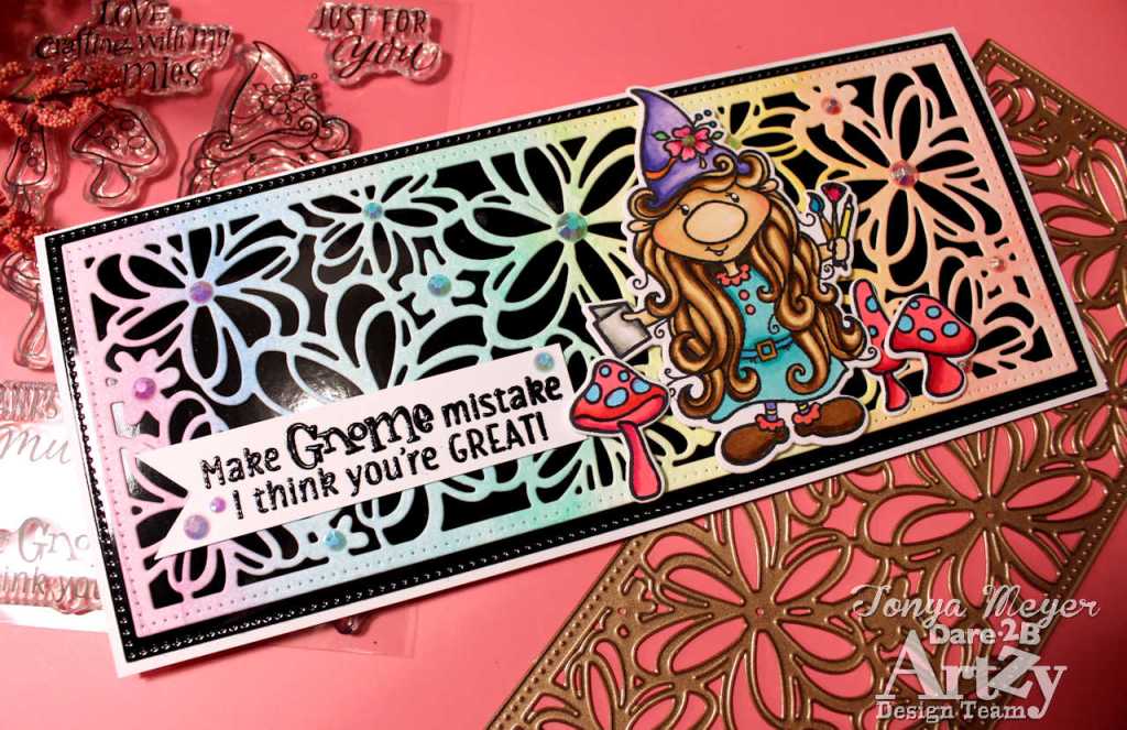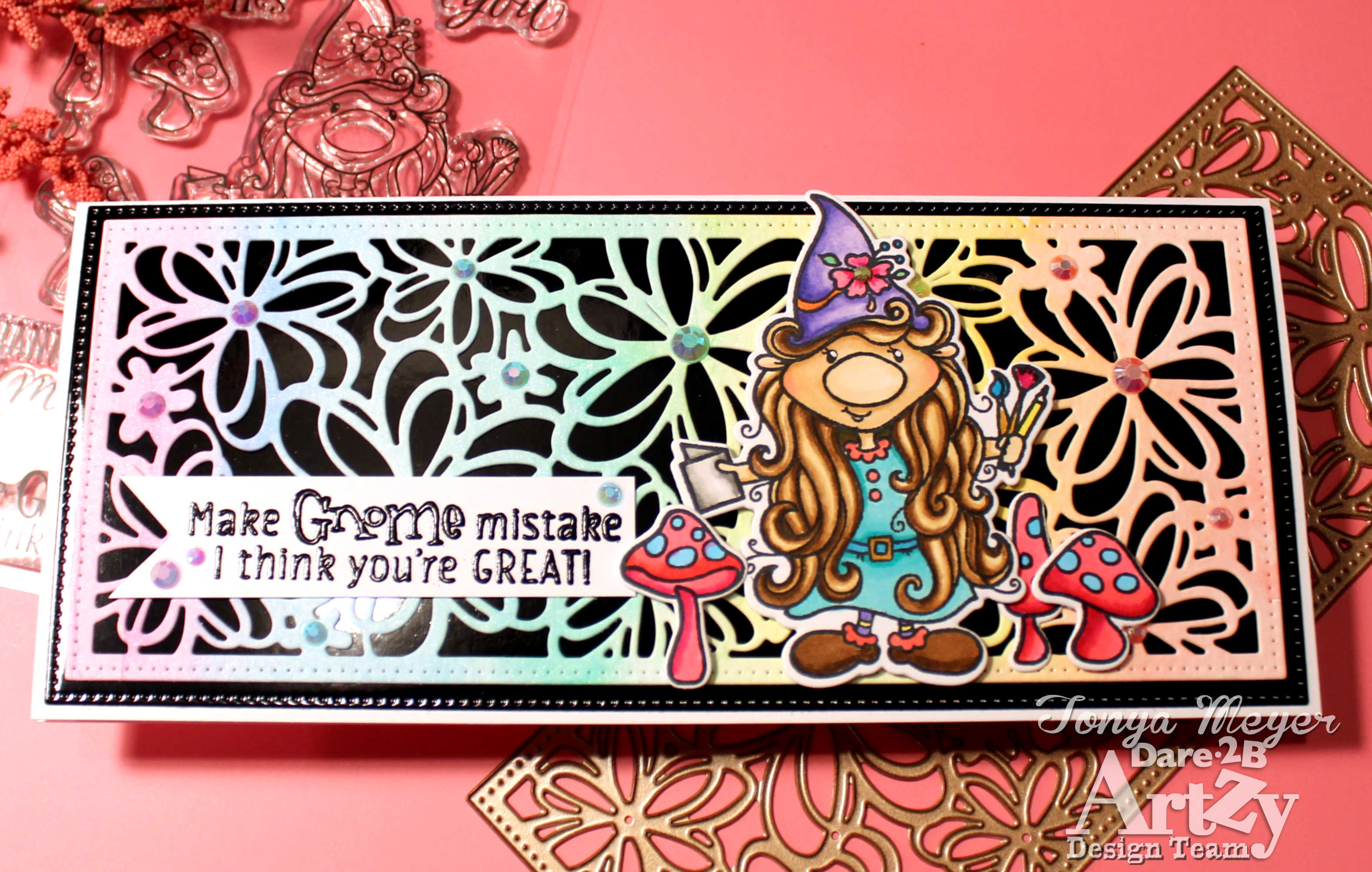 Next up, I colored the Dare 2B Artzy Crafty Gnome stamp set with m Chroma Alcohol Markers. I chose to use some bright fun colors for my little gnome. I also stamped and colored the 3 mushrooms in the set. I definitely have never seen hot pink and blue mushrooms, but I think they had a fun touch to the card.