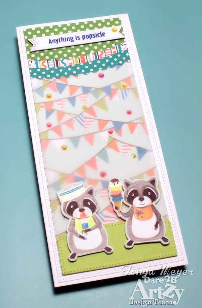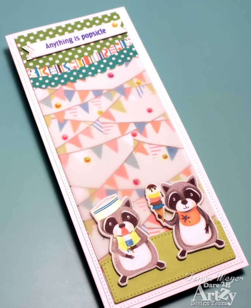 I used the dies for the Raccoon Party in conjunction with the Ice Cream Bandit paper and die cut two of the adorable raccoons from the paper. I also cut two additional raccoon silhouettes from some plain white cardstock.