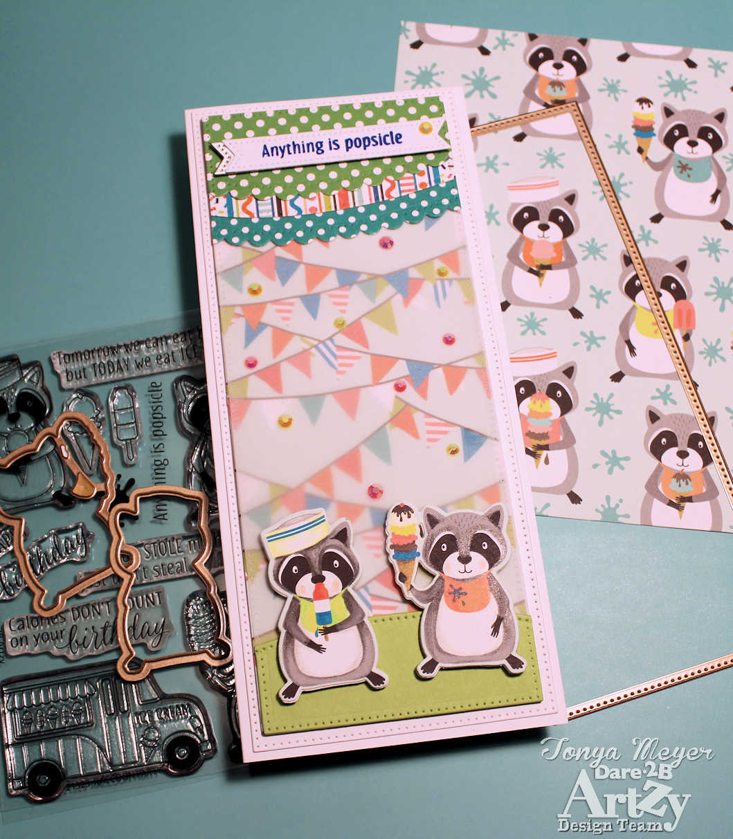 I used the dies for the Raccoon Party in conjunction with the Ice Cream Bandit paper and die cut two of the adorable raccoons from the paper. I also cut two additional raccoon silhouettes from some plain white cardstock.