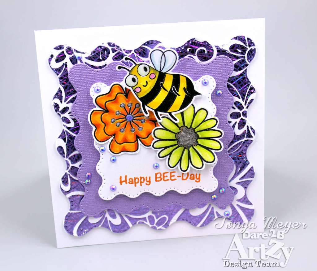 The flowers and bee were layered on the card with additional dimensional foam to make them pop a bit and give the card panel even more dimension.