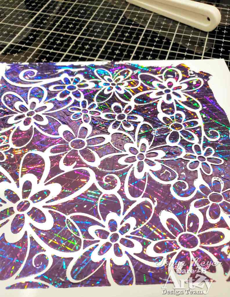 Once it’s run though the MINC, I carefully peeled back the foil to reveal the beautiful Dare 2B Artzy floral background. It’s so pretty in person!! Not sure that pictures really show all the shimmer and unique design of the foil. Here’s a look at the finished foiled background.