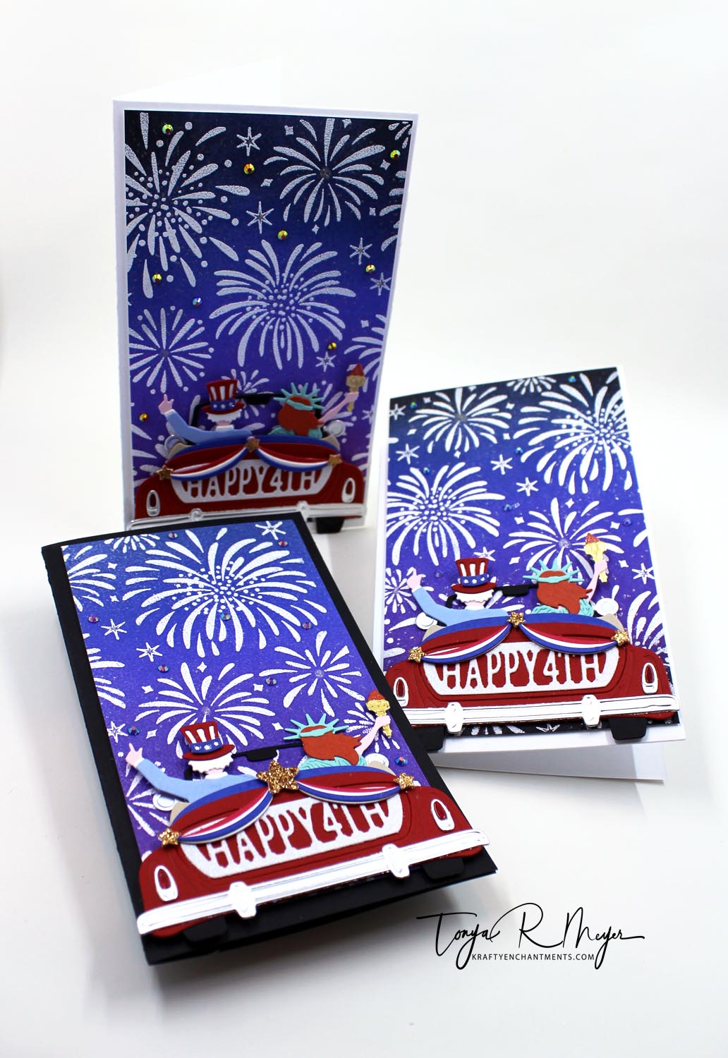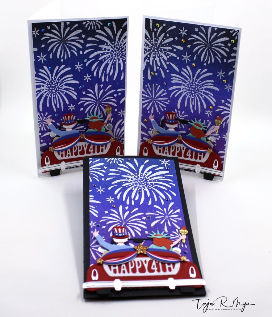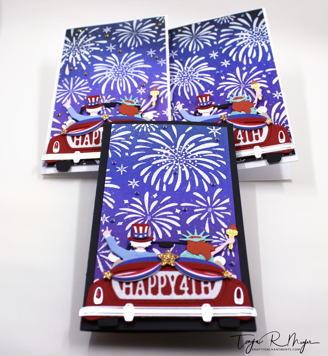 After I had my cars completely assembled, I needed to figure out a 4th of July worthy background. I had recently watched a video on Hero Arts YouTube channel from Mindy Eggen and I loved what she had done with the Hero Arts Fireworks Bold Print cling background stamp. Here’s a link to that video on how she created the background for her cards using the same stamp: (1340) Gel Press Emboss Resist Technique – YouTube