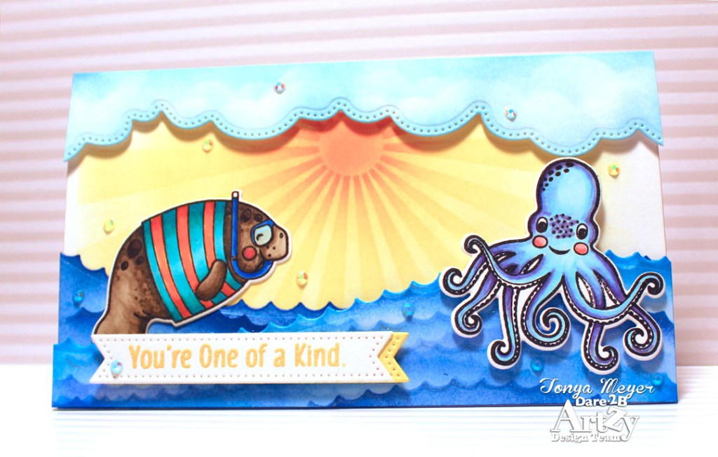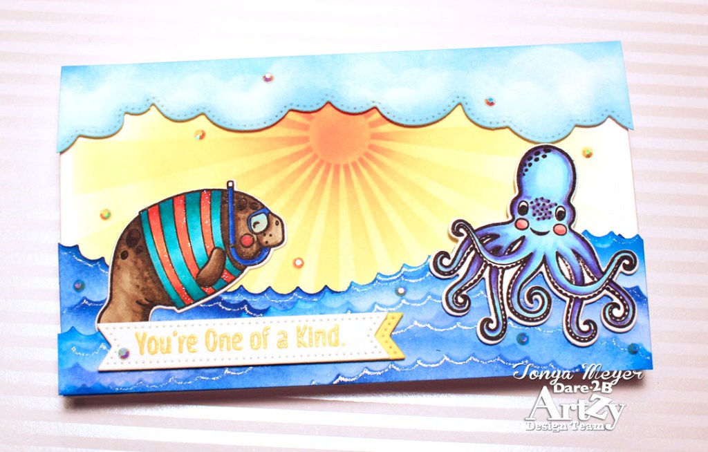 Next, I stamped and colored one of the snorkeling manatees and the octopus from the Seas the Day stamp set. I colored them with my Croma Flagship Alcohol markers. When I’d finished coloring I used the coordinating die set to cut out my images.