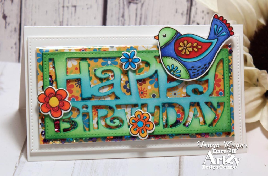 Hope everyone is having a great day! I’m back with another Dare 2B Artzy card. My card today features the Mini Slimline Happy Birthday die and one of the adorable birds from the Joyful Robin stamp set to create a bright, fun Birthday shaker card.