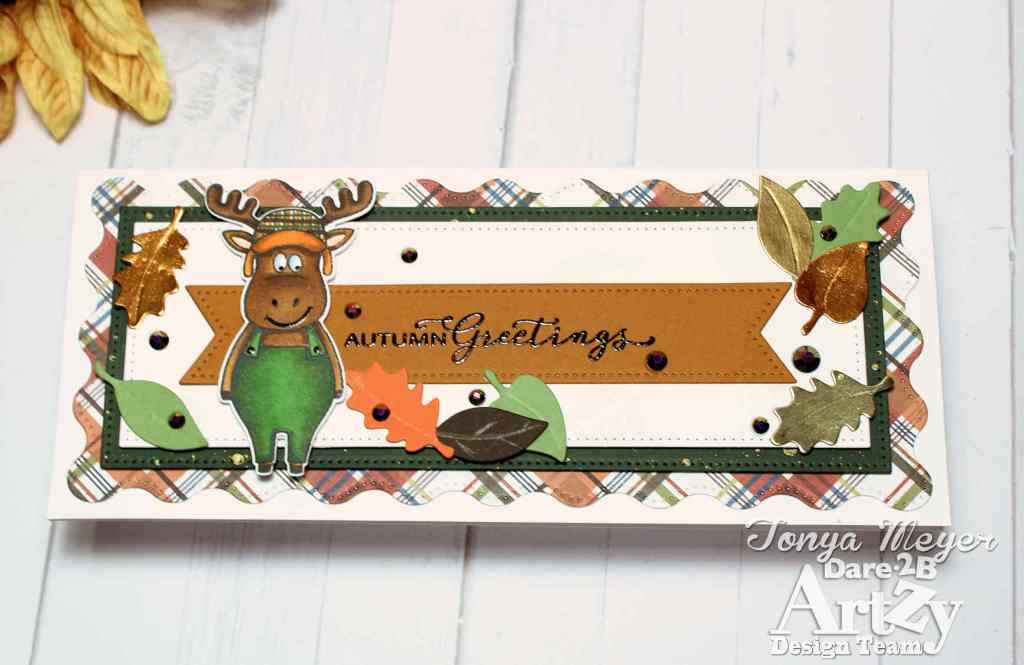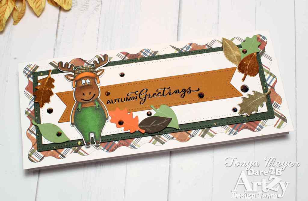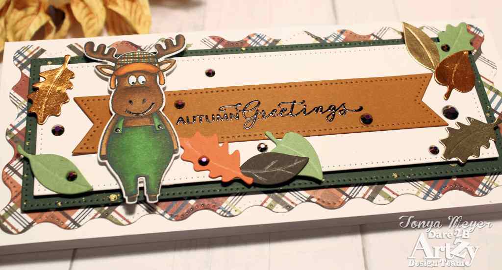 I have a fall themed slimline card today using the Mr. Moose from the Chrismoose stamp set and some leaves from the Foxy Greetings stamp set.