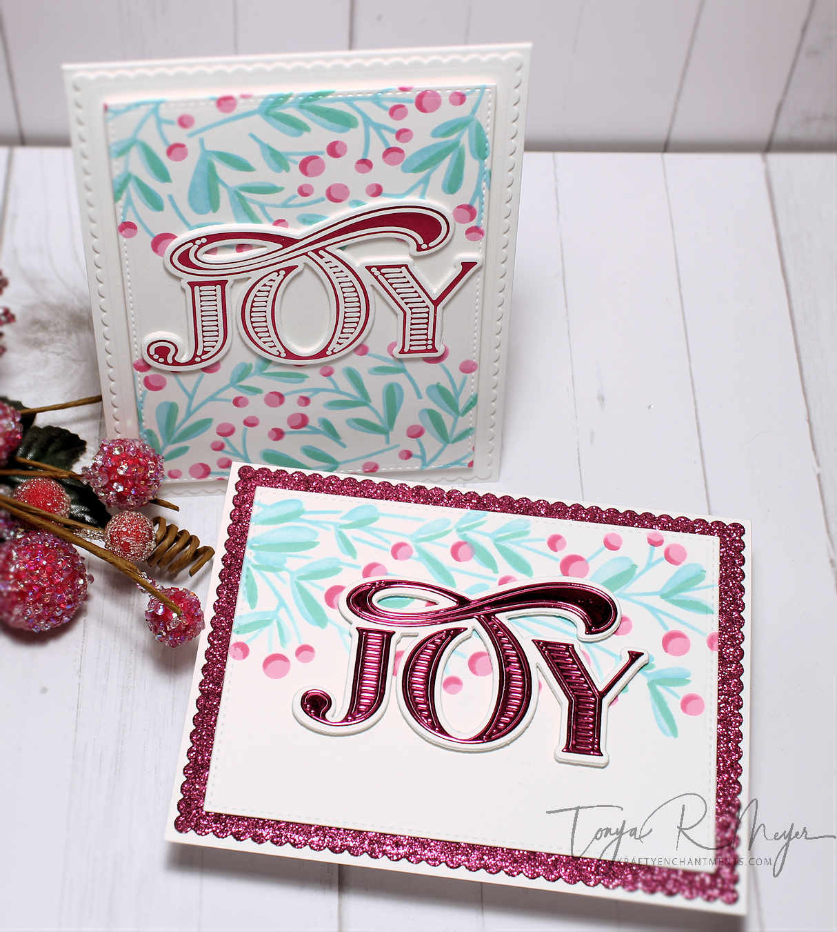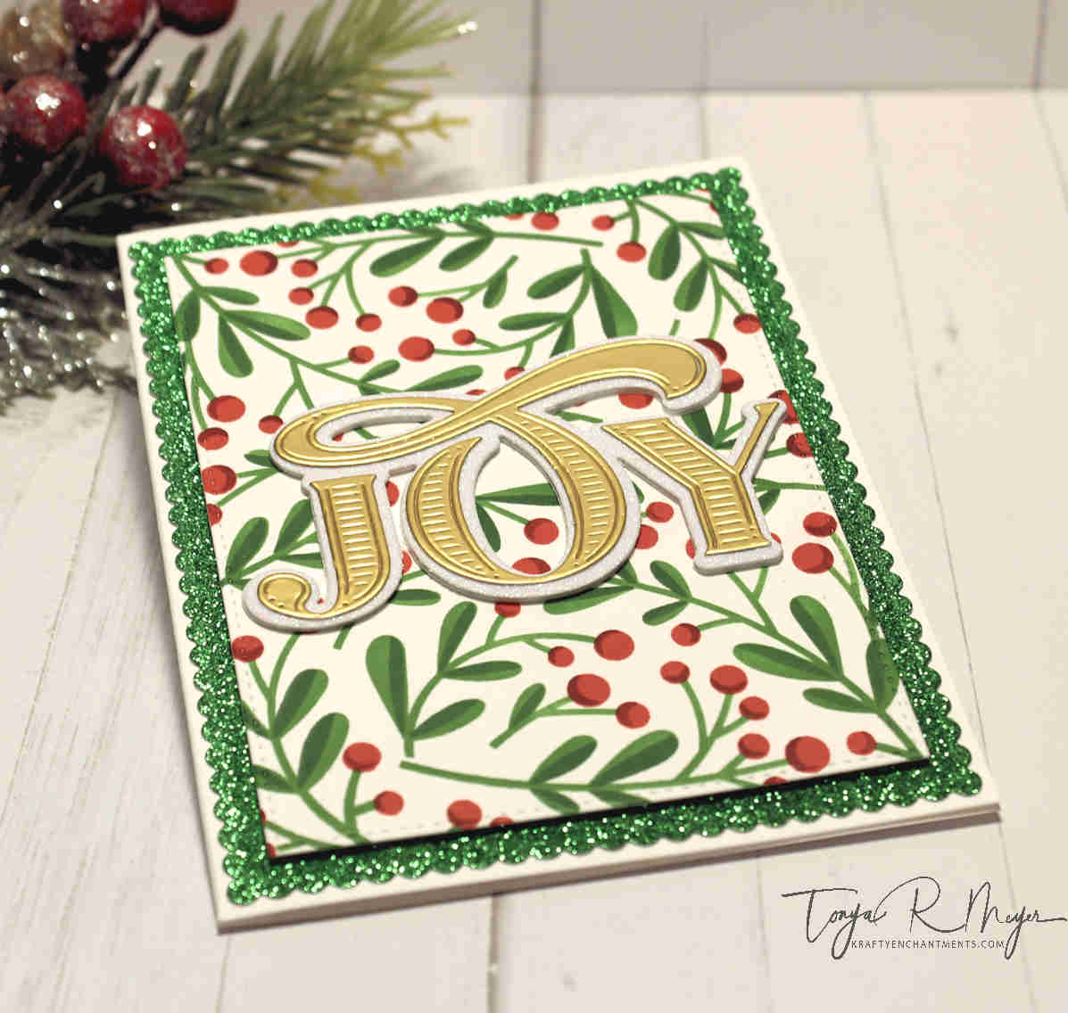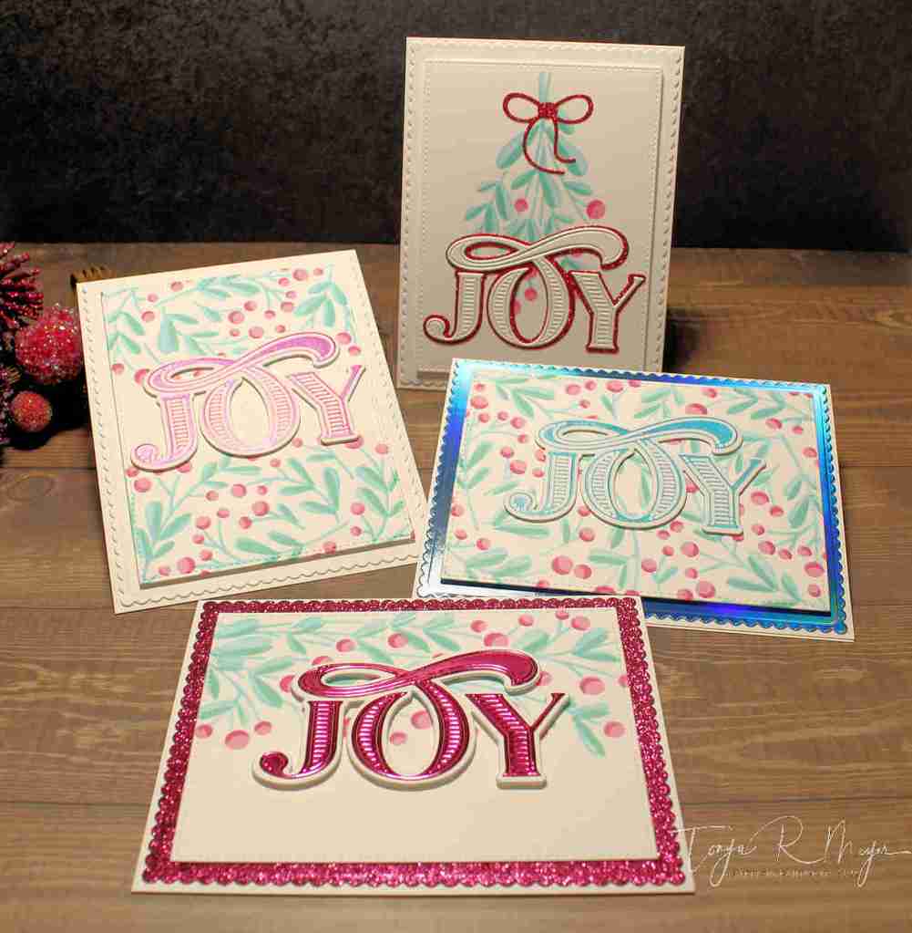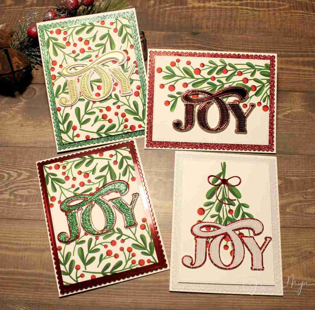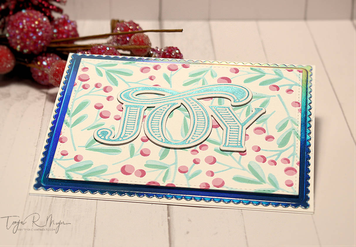 Next, I chose to use the beautiful Abundant Joy sentiment die from The Greetery. This was a new release die for 2021. The die has a shadow layer that comes with it and there is also a coordinating hot foil plate as well which I used for a couple of my cards today.