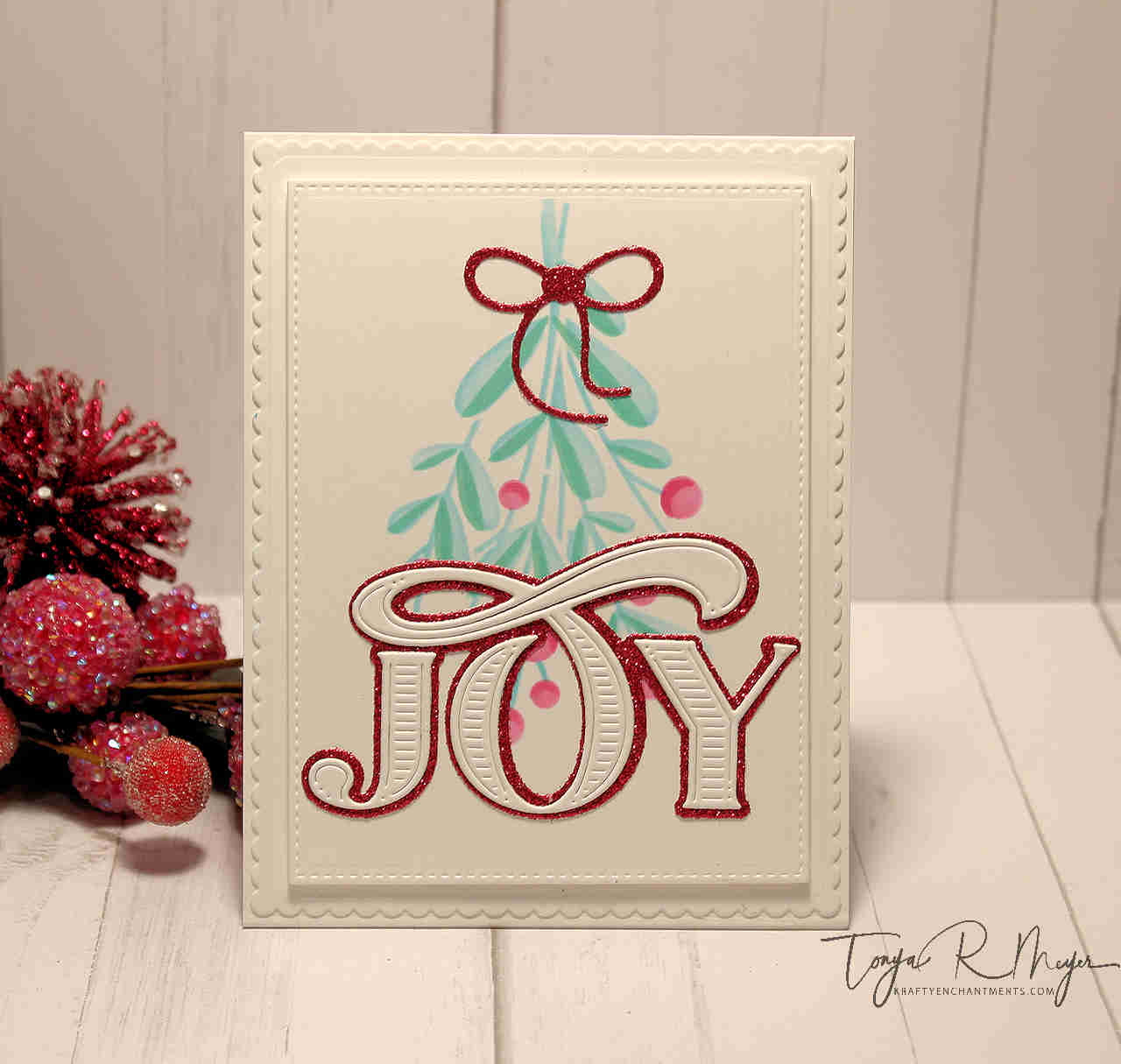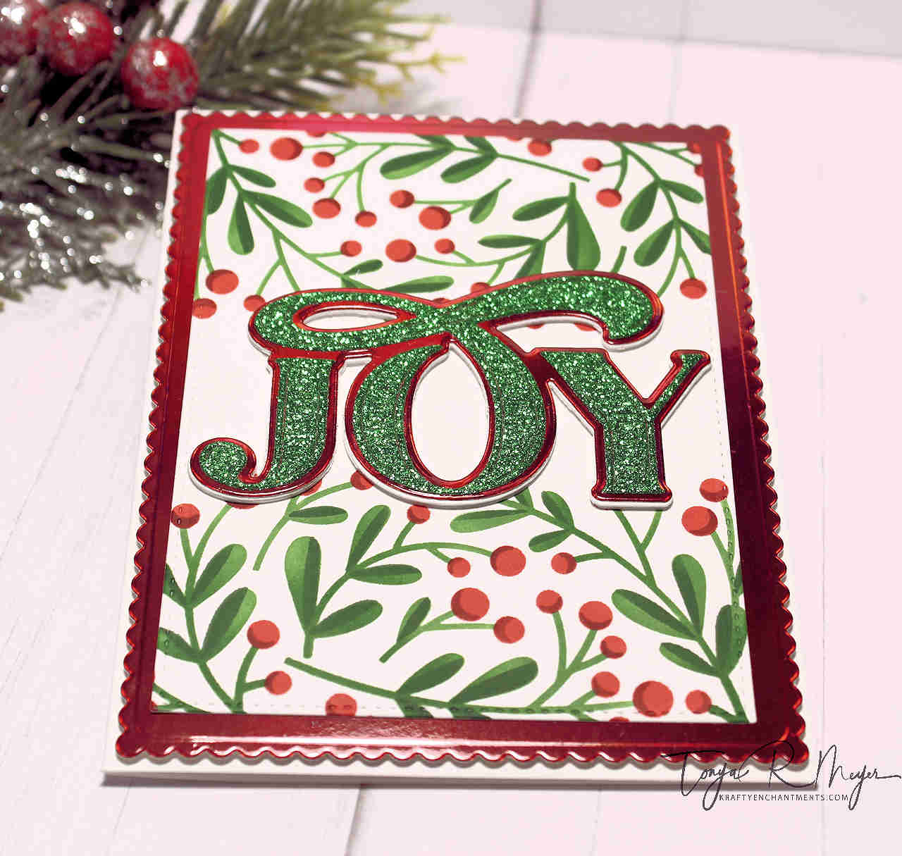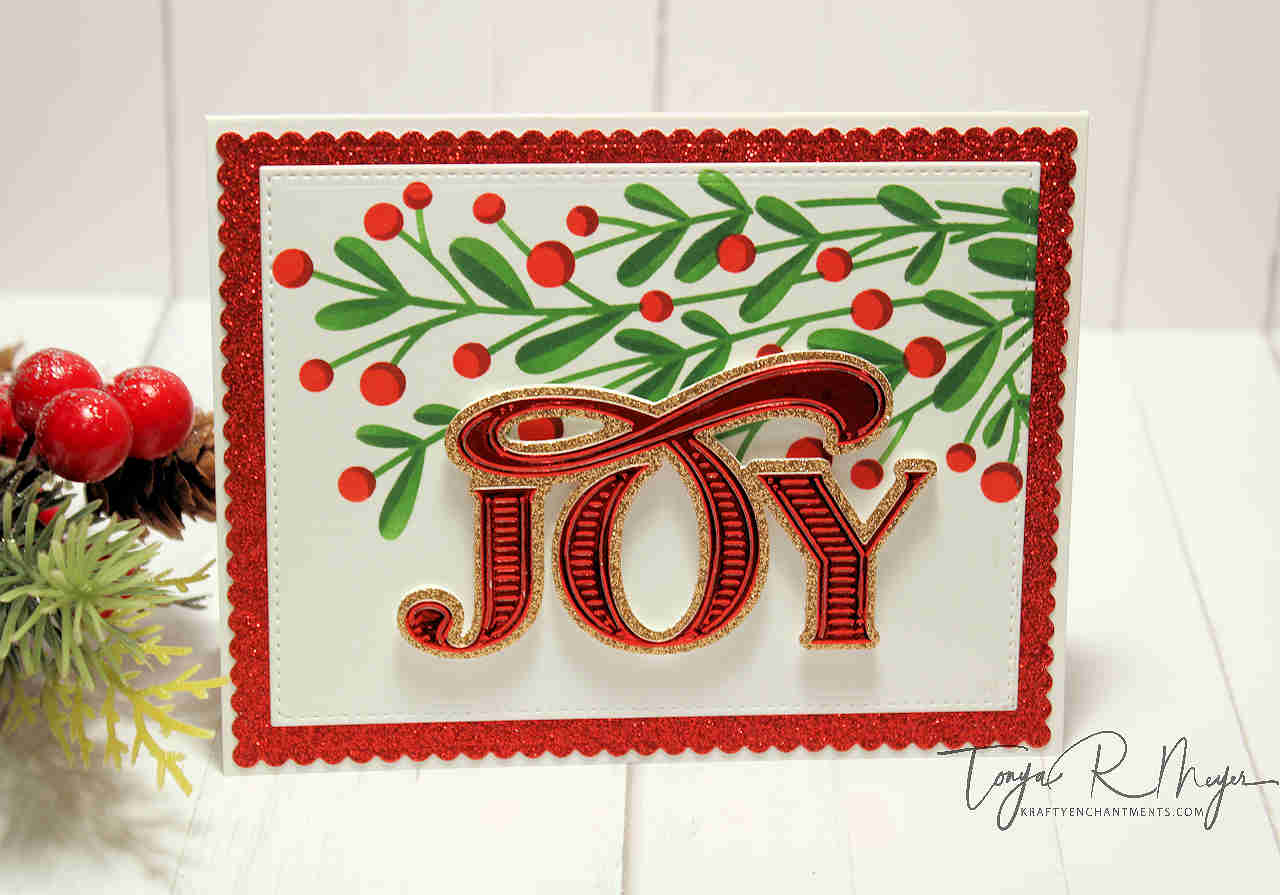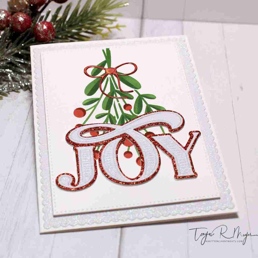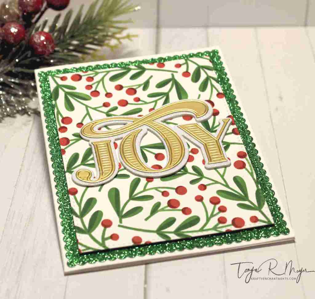I die cut several of the Abundant Joy sentiments from the same glitter and iridescent cardstock and set them aside. Something to note, the JOY sentiment cuts the letters individually not all as one piece so you do have to adhere the letters to the shadow layer individually. I found that adhering the O first made it easier to line up the other letters.
