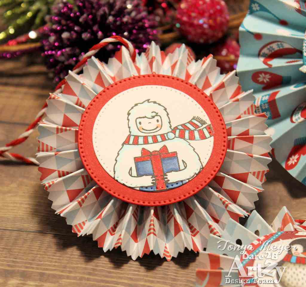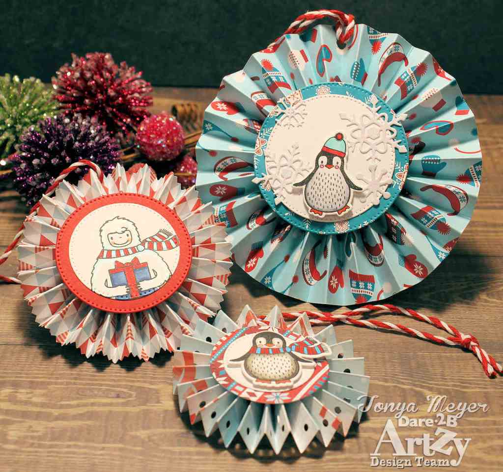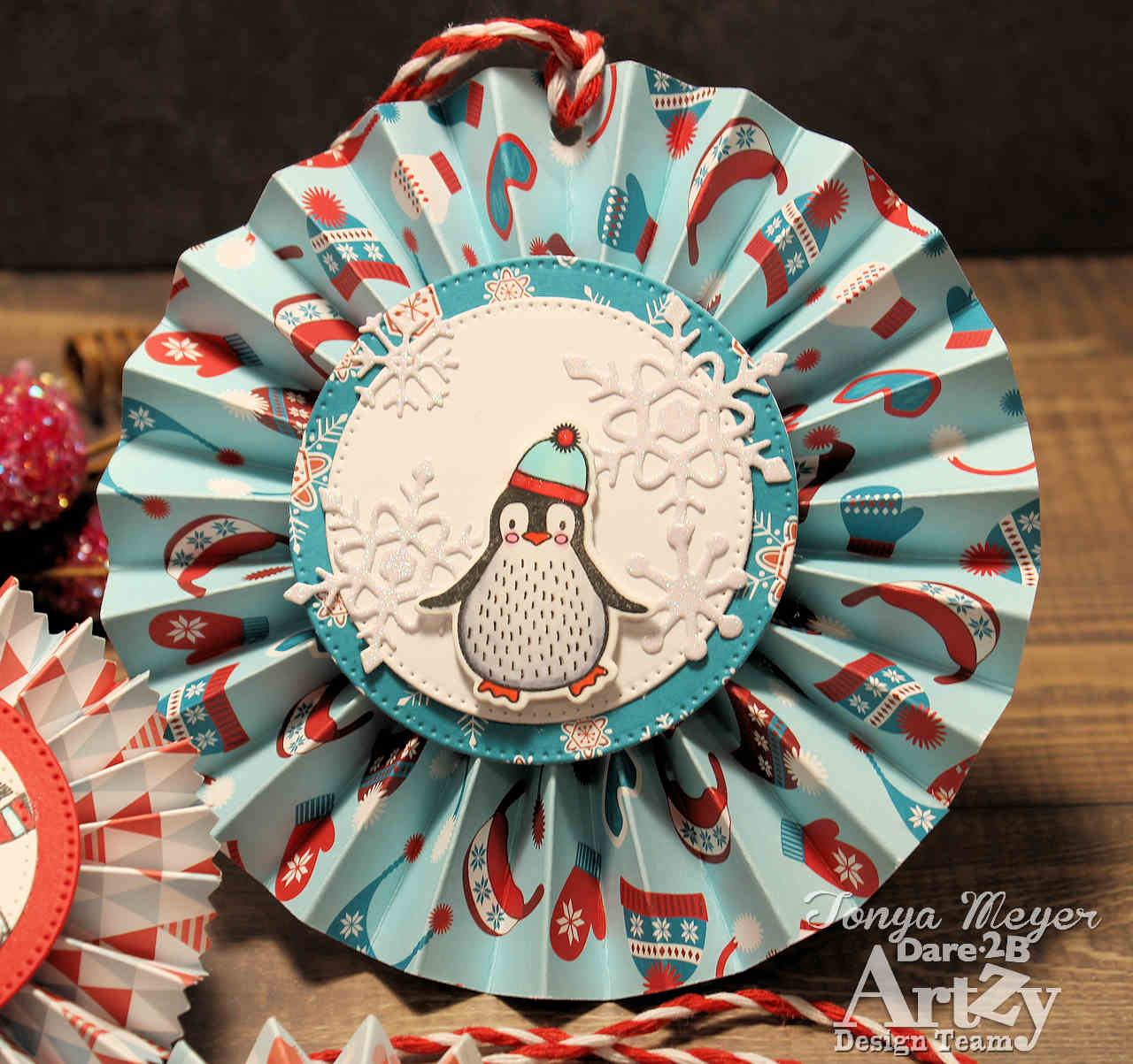 For paper, you’ll want to pick a good sturdy scrapbook paper or a paper that’s not too heavy. I would suggest not using anything too heavy because you will need to make a crisp accordion fold. I think that double sided 12×12 scrapbook paper like Dare 2B Artzy’s Penguin Plunge, Yeti for Winter, That’s a Wrap or Wooly Winter are perfect for making these rosettes. All are double sided with fun images and graphics on both sides.