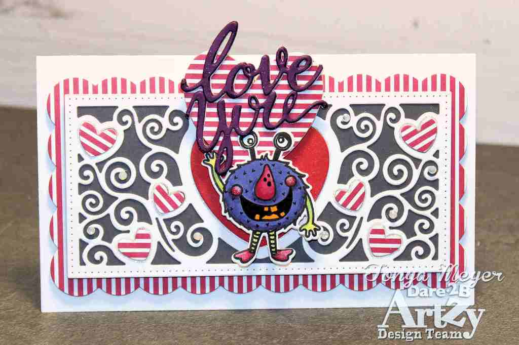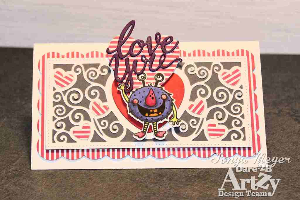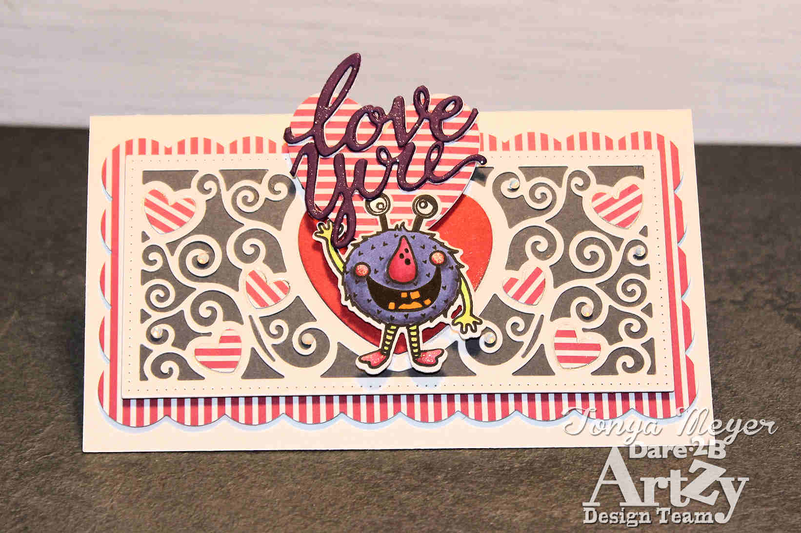 The card I created for the challenge features the amazing new Slim Mini Heart background die and one of the cute little creatures from the Cosmic Creatures Stamp Set. Both of these are from the latest release over at Dare 2B Artzy.