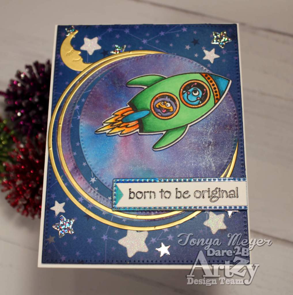 I layered on my rocket with the alien passengers with some dimensional foam. Next, I stamped and heat embossed the sentiment, “Born to Be Original” with some black embossing powder and added it to a piece of blue holographic cardstock.