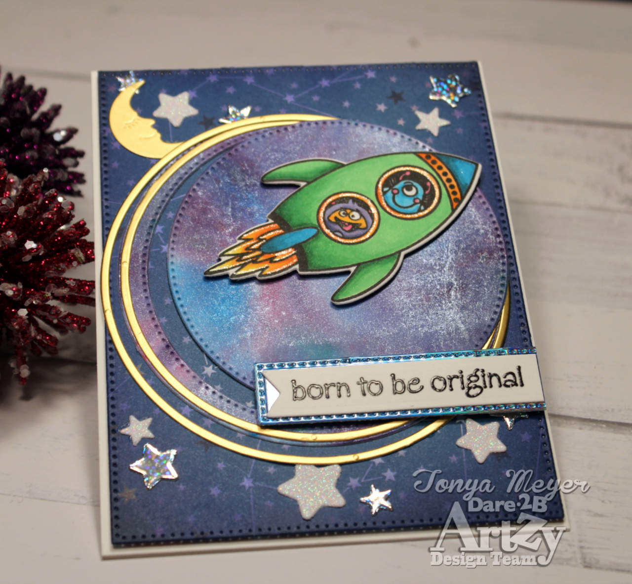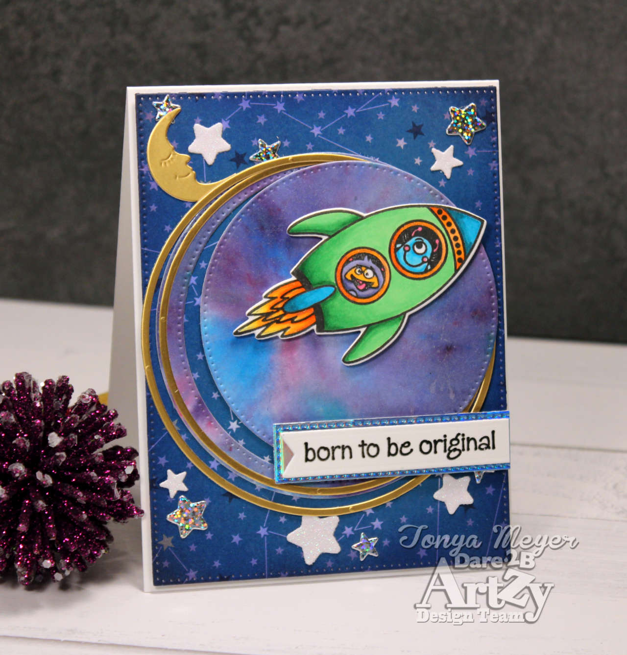 I layered on my rocket with the alien passengers with some dimensional foam. Next, I stamped and heat embossed the sentiment, “Born to Be Original” with some black embossing powder and added it to a piece of blue holographic cardstock.