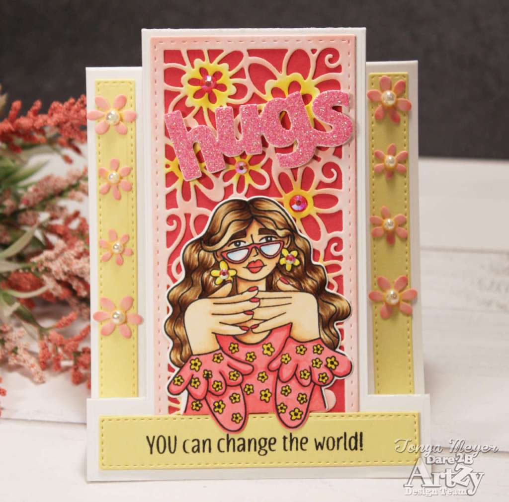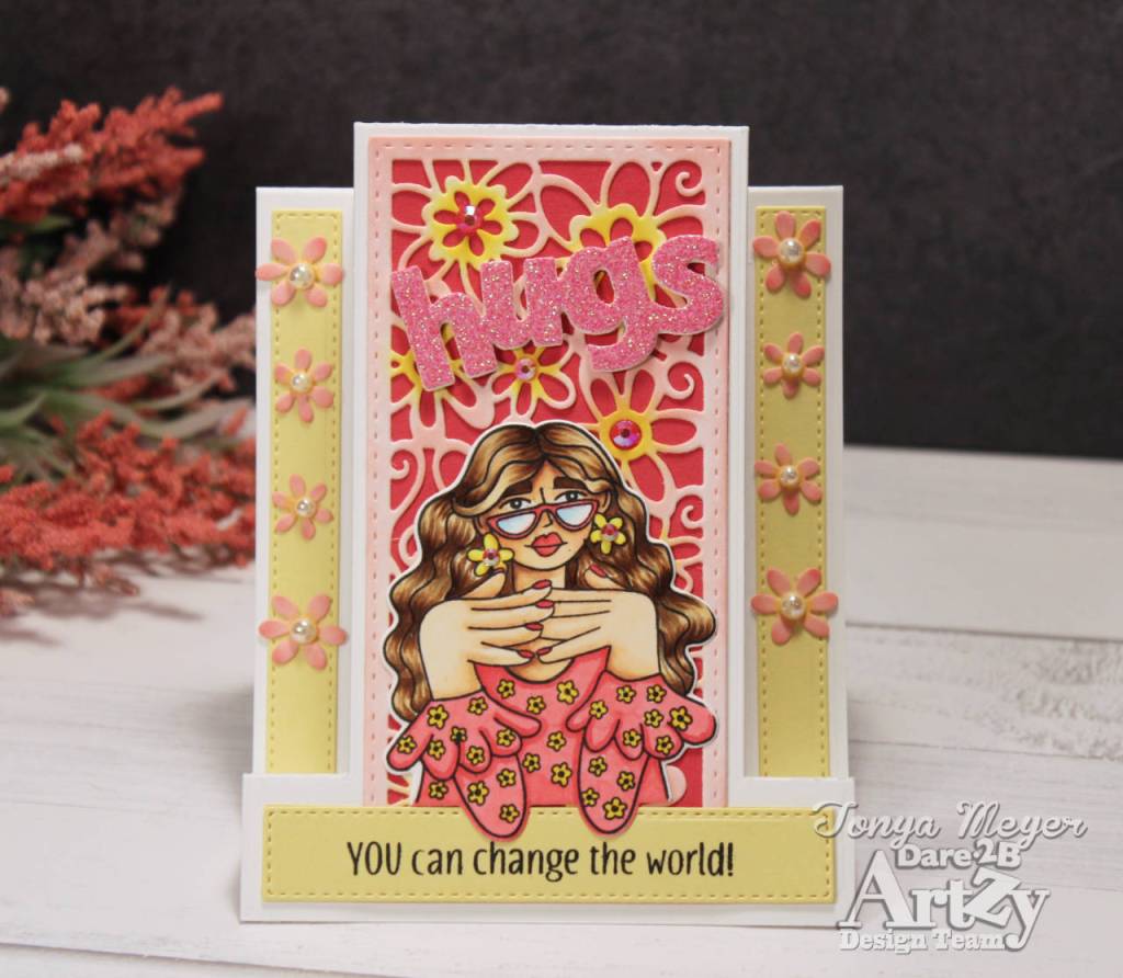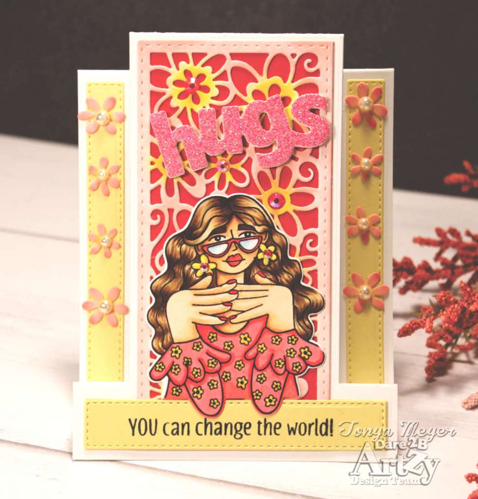 On the bottom portion of the Center Step Die, there is a section with a die that is perfect for stamping your sentiment. I cut a piece of light-yellow cardstock and stamped the sentiment, “YOU can change the world!” from the Good Vibes stamp set using Dare 2B Artzy’s Totally Black Ink.