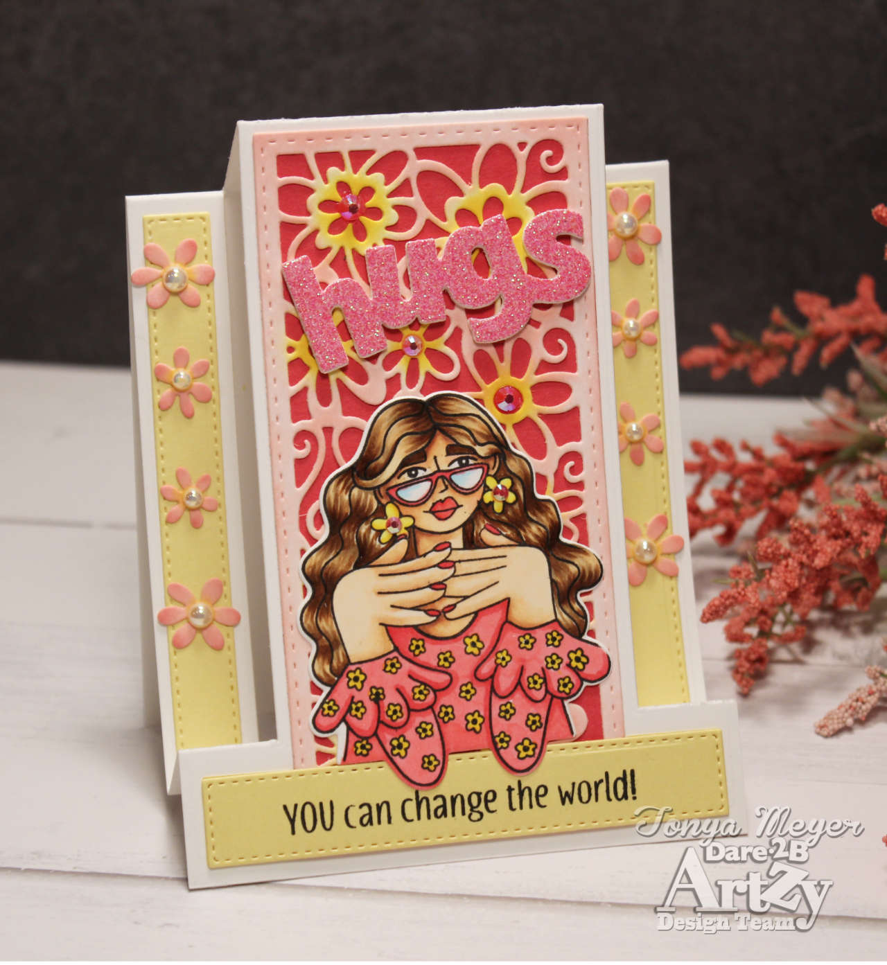 On the bottom portion of the Center Step Die, there is a section with a die that is perfect for stamping your sentiment. I cut a piece of light-yellow cardstock and stamped the sentiment, “YOU can change the world!” from the Good Vibes stamp set using Dare 2B Artzy’s Totally Black Ink.