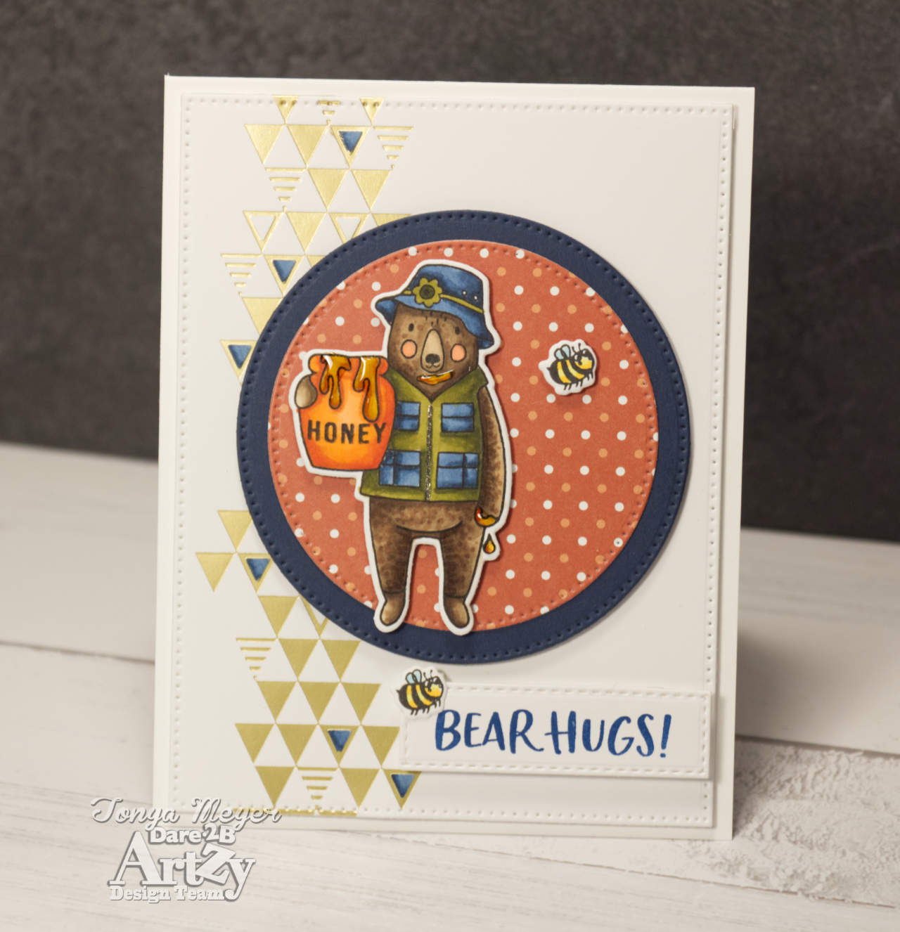 Finally, I finished the card with the stamped the sentiment Bear Hugs and die cut it with a rectangle strip from the Center Step die set.