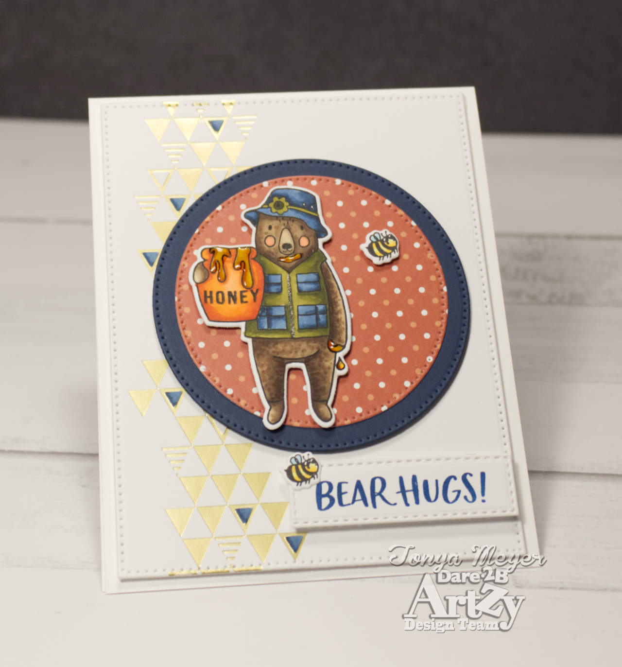 Next, using another piece of the new Hamilco paper; I stamped and colored the cute bear with the honey pot from the Honey Bears stamp set. I wasn’t sure this was necessarily a masculine bear, but I think I colored it to look like a masculine bear using some darker shades of green and blue. For the honey on the bear’s paw and face as well as the Honey Pot I used some golden yellows with a darker yellow for shading and then I used some Glossy Accents on the honey to give it a shine and make it look realistic. I love that look. I also stamped and colored two of the tiny bees from the stamp set.