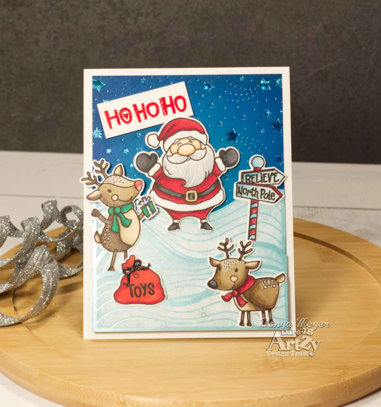 I used an Aqua Shimmer pen on my reindeer’s nose, the scarves, the trim on Santa’s suit and hat and finally on the North Pole sign.
