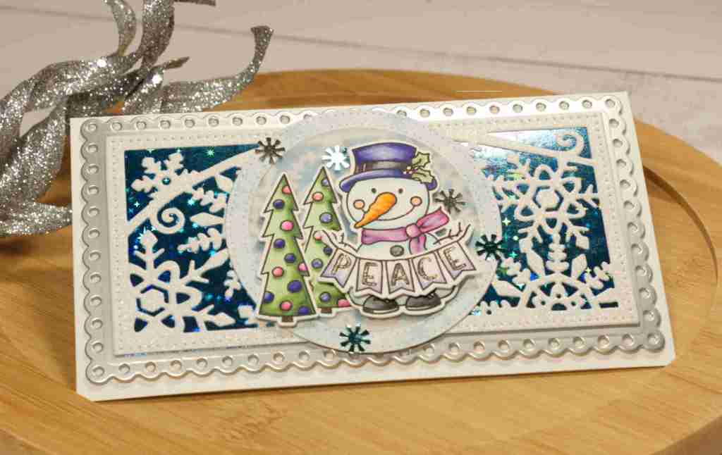 Finally, I stamped the adorable snow person with the top hat along with a tree and the banner that reads, “Peace”.