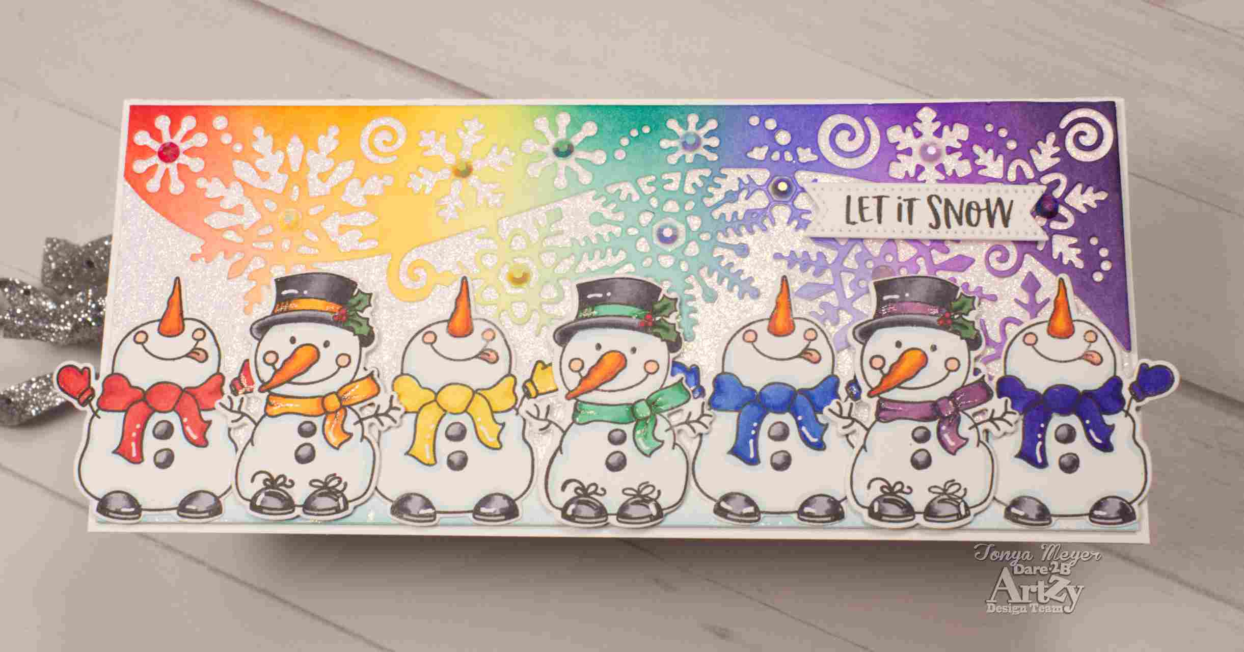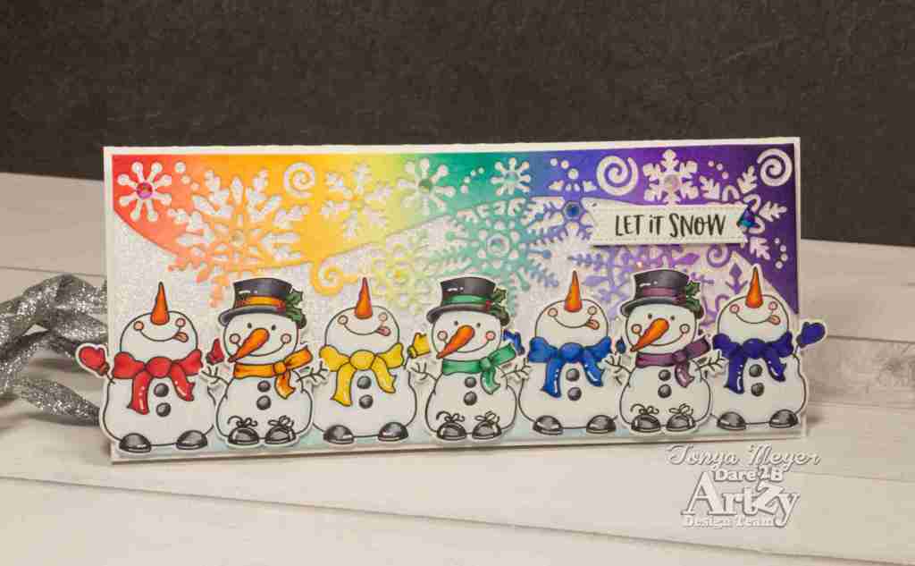 I am back today with another colorful card featuring the new Dare 2B Artzy Frosty Hello stamp and die set. I just cannot get enough of these adorable snowmen.