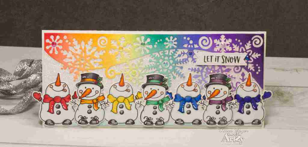 I stamped and colored 4 of the snowmen that were looking up and 3 of the snowmen in the top hat. Each snowman was given one of the colors of the rainbow and they were colored with Copic Markers to match the ink blended snowflakes. I cut all of the snowmen out using the coordinating die set.