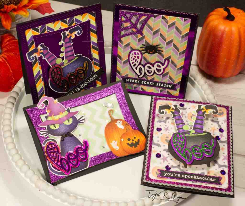 Hello and welcome back! Today I am sharing a group of fun Halloween cards created with the Taylored Expressions Create-in-Quad’s Halloween Layering Stencil and coordinating dies.