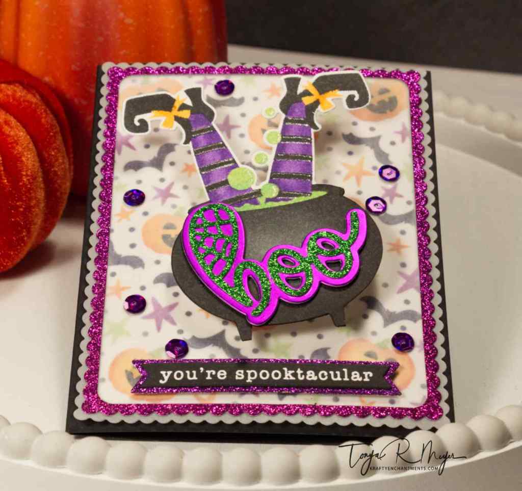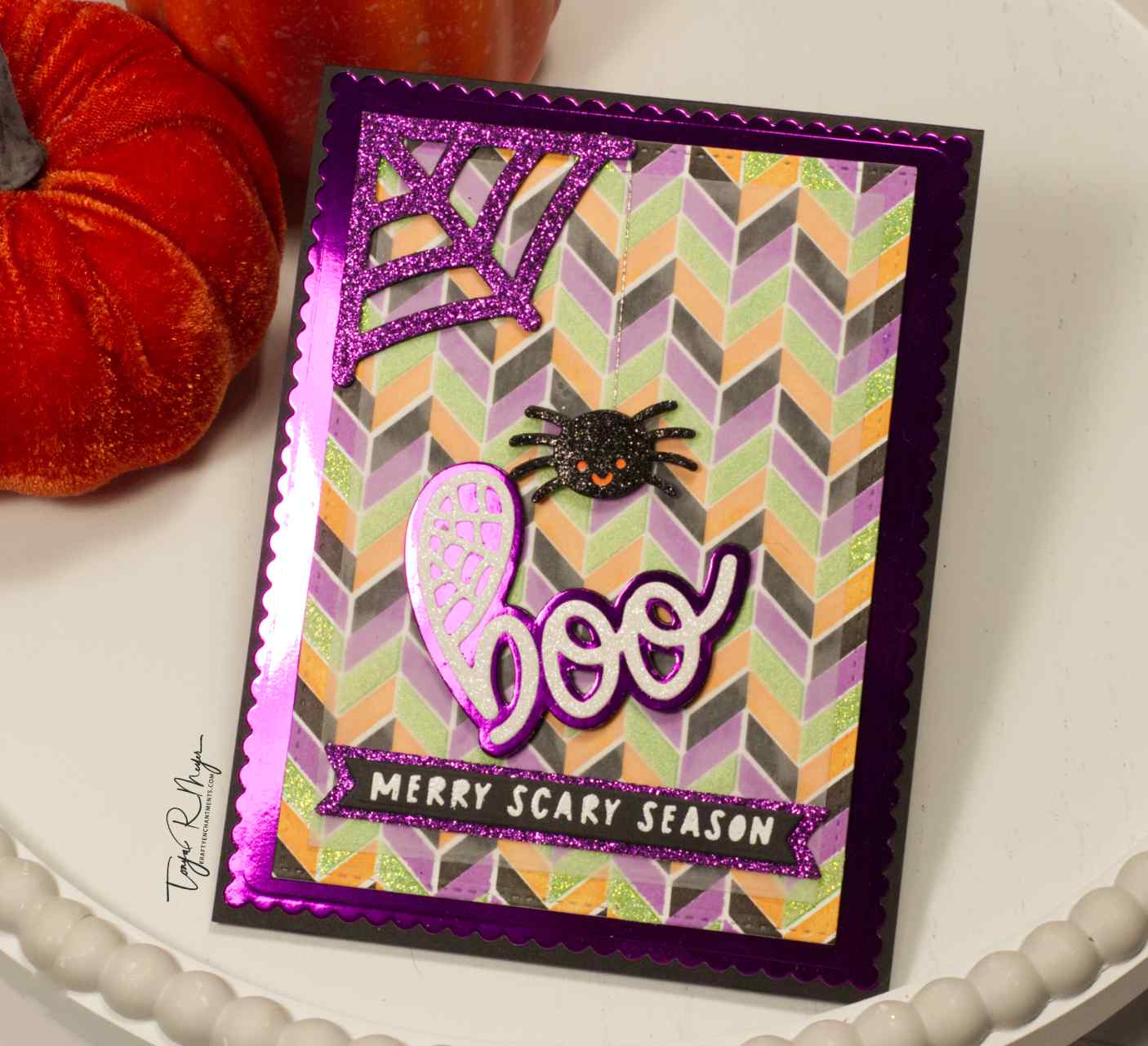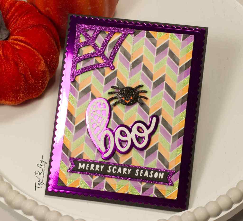 For these cards, I also used the new Boo Script & backer die from Taylored Expressions. I love the little spider web detail on this die. I cut several of the BOO words from foil and glitter card stock in my stash. For two of the backers, I used matte and shiny purple foil card stock from my stash. On the other two I used the new Foil It Spider web and some toner foil from Thermoweb called Rainbow Shattered Glass. I LOVE, LOVE this foil. It’s so pretty.