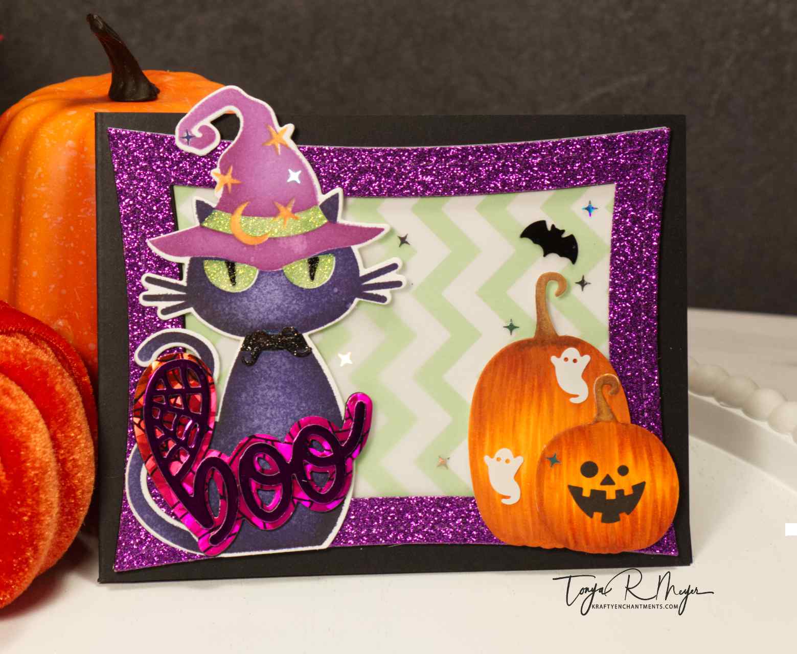 Taylored Expressions has these cool layering pumpkins but I decided to just die cut two of them in different sizes from some white card stock and then I colored them with my Copic markers. To add the face to the smaller pumpkin, I used some Detail Black ink from Pretty Pink Posh and Ink blended on one of the faces from the Jack O’Lantern Stencil from Taylored Expressions. I love all of the faces in this stencil. You can create a whole background or you can use them with the little die cut pumpkins and they look so cute! The pumpkins were added to the A2 horizontal card with the kitty.
