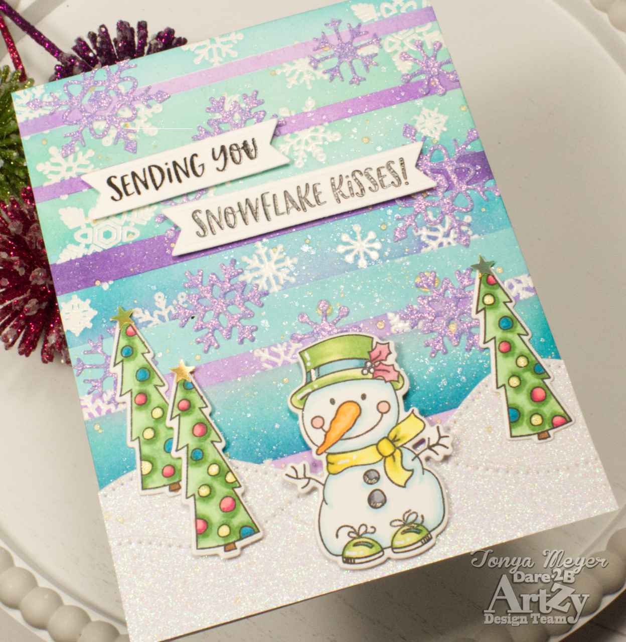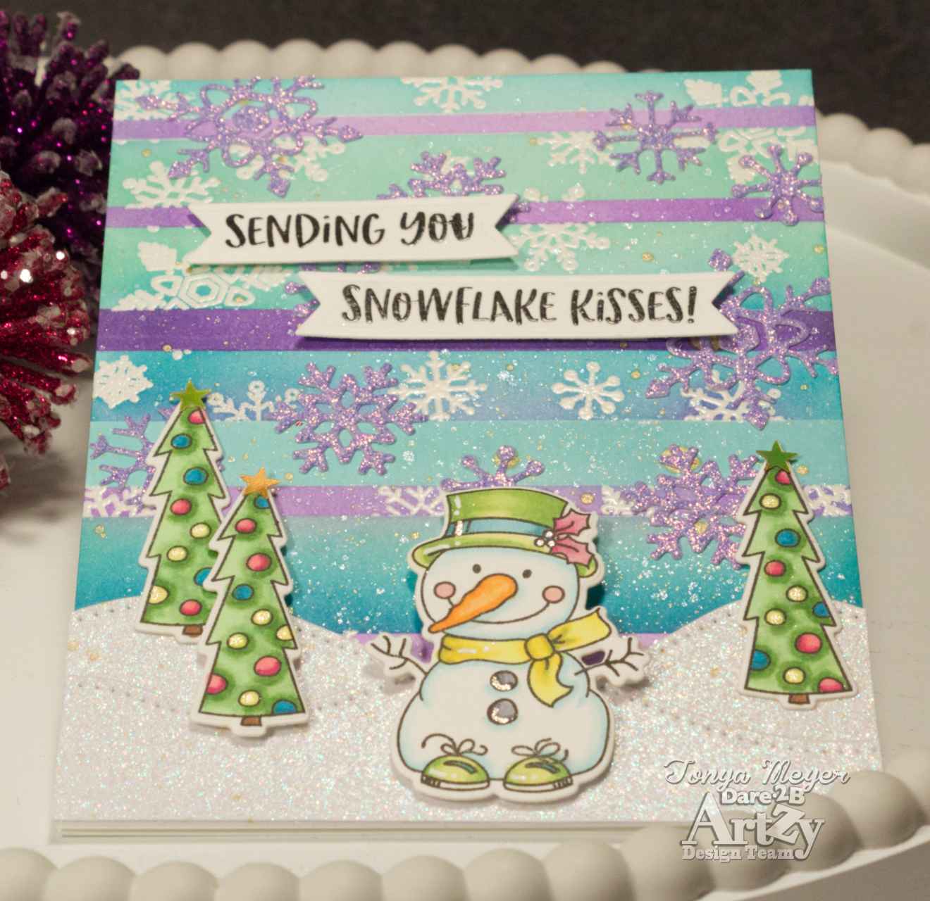 To cover up some of the blobs of gold splatter, I dug out some snowflake dies from several of my Dare 2B Artzy die sets; Santa’s Reindeer, Toboggan Fun, and Yeti 4 Winter. I die cut quite a few of the snowflakes from some light purple glitter paper. I used some Bearly Arts glue to adhere the snowflakes to the background. These strategically covered up the blobs I didn’t like, LOL!