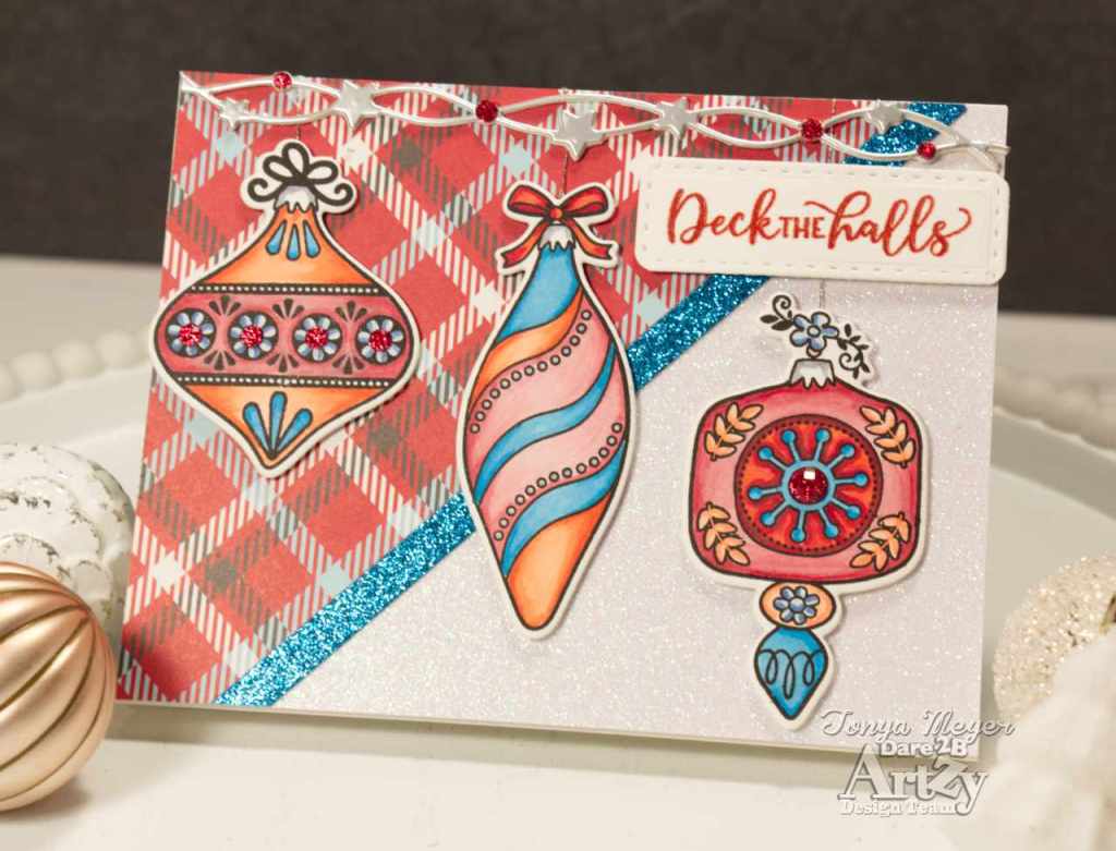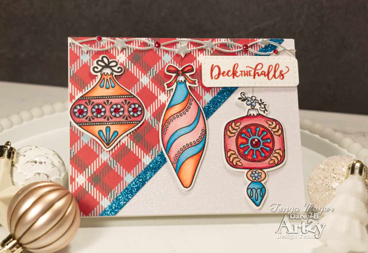 Today, I am playing with the Deck the Halls stamp and die set. I love the retro ornaments in this set and they are so fun to play with and color.
