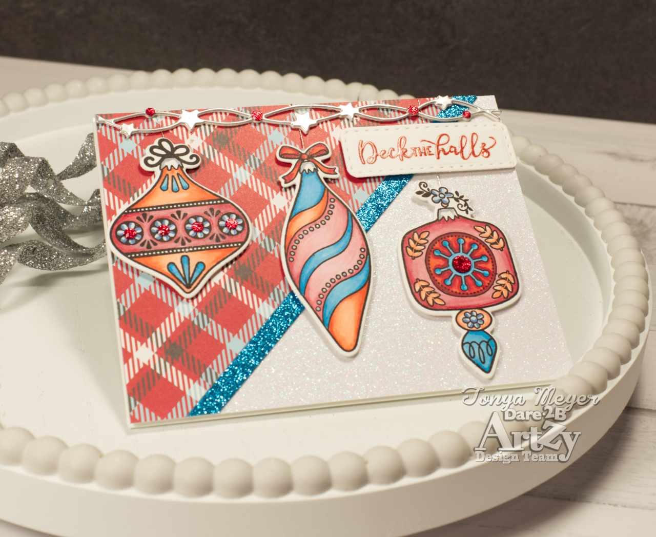I added some dimensional foam to each of the ornaments and also added a piece of silver DM Embroidery floss which I folded over the top of the card base and taped in place on the back.