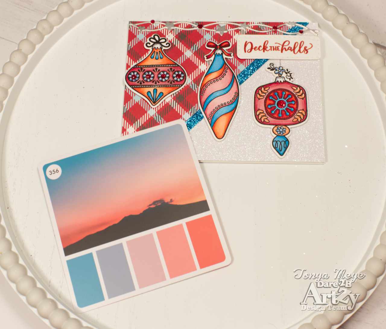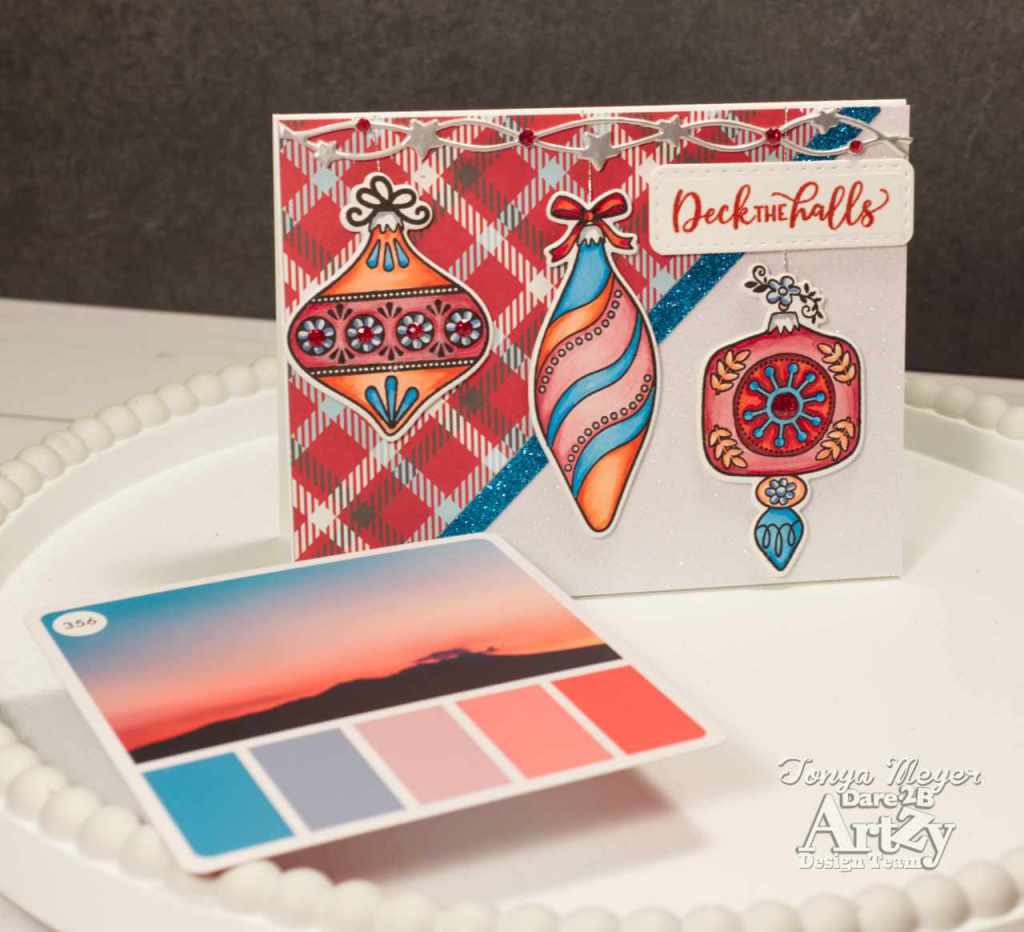 For this card, I decided to challenge myself to use a random color pallet for inspiration to color my retro ornaments. To do this, I used The Color Cube and pulled out a photo with some color swatches that I liked that would compliment my plaid background and then I tried to match my Copic markers to the colors. I kind a love having these Color Cube cards handy when I am looking for color inspiration.
