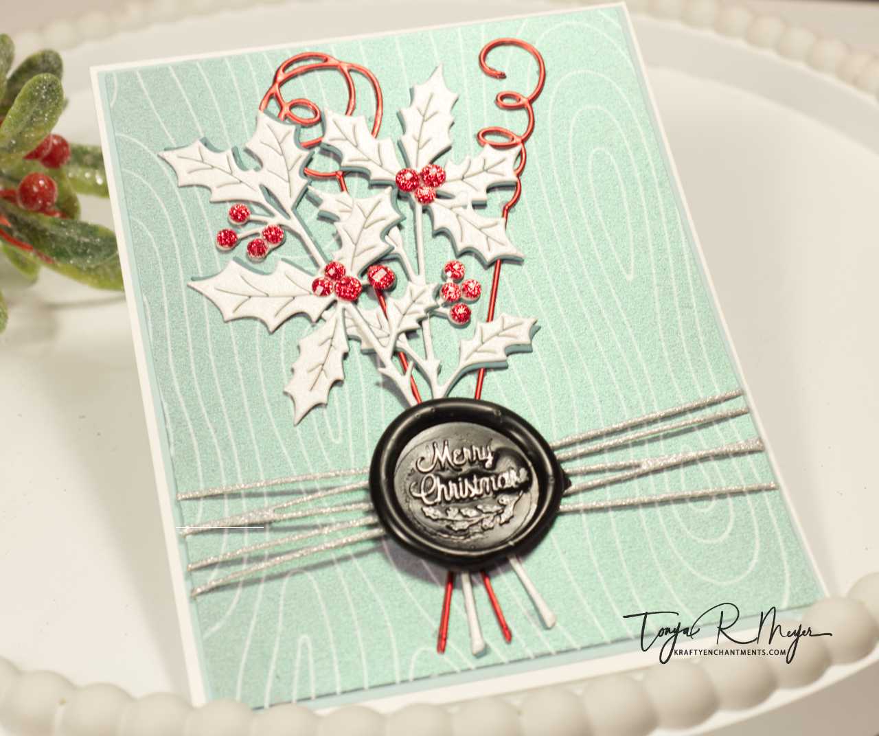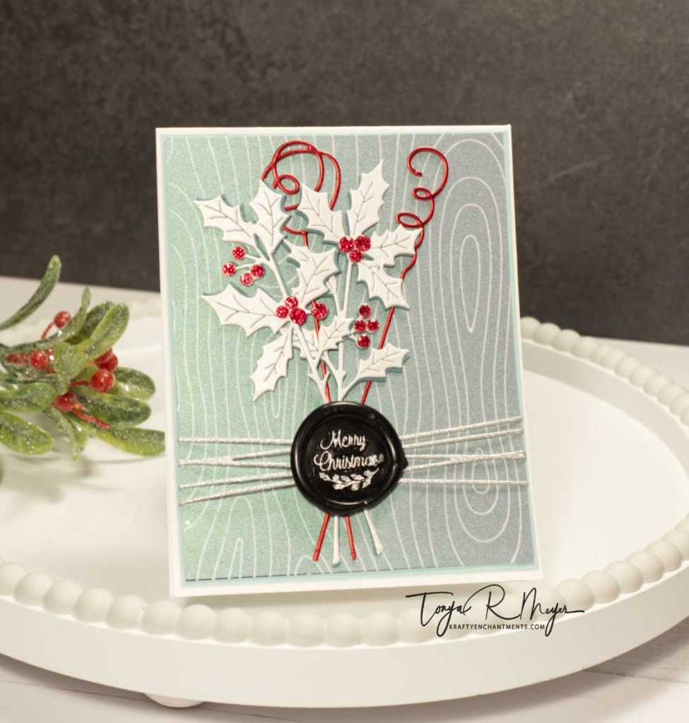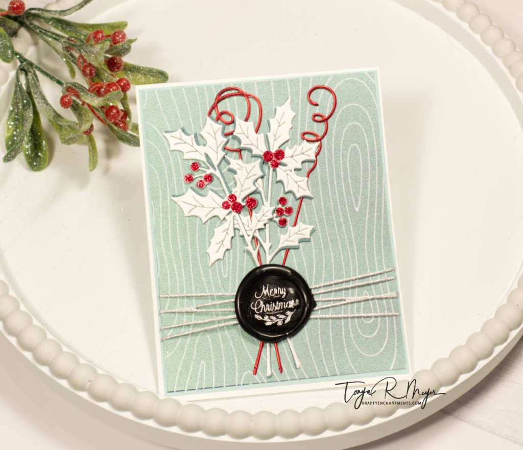 To create my wax seal elements, I die cut the Spellbinders Holly Sprigs from some white shimmery cardstock in my stash and cut a second lighter teal green cardstock to create a shadow layer. The Sprigs are very delicate when they are cut so I thought that a shadow layer would provide some stability when glued together. I also cut a couple of the Squiggles dies from the Sealed Collection using some red foil cardstock from Tonic. I did layer these as well to provide more stability to the delicate die cuts.