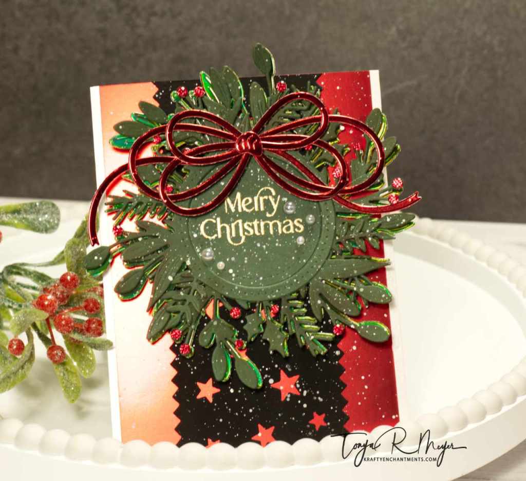 Next, I created a bow for the wreath using the Loopy Bow Builder Die from The Greetery. This fun bow die allows you to create various bow looks by simply layering up the die cuts and placing the ends to the side or bottom. You can add as many or as few loops as you like and then adding a tiny amount of glue to the center and finishing with the little bow center die cut. I cut two of these bows from some Tonic Studios Ruby Red foil cardstock so that I would have 6 loops total