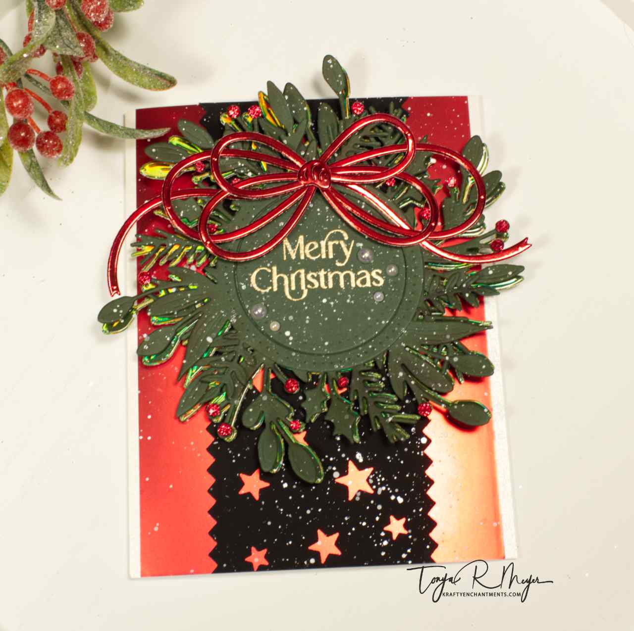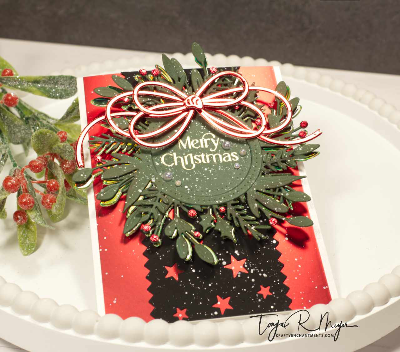Finally, I added my wreath and background onto a layer of shimmery off-white pearlescent cardstock which peeks out on the left and right of the panel before placing it onto my card base.